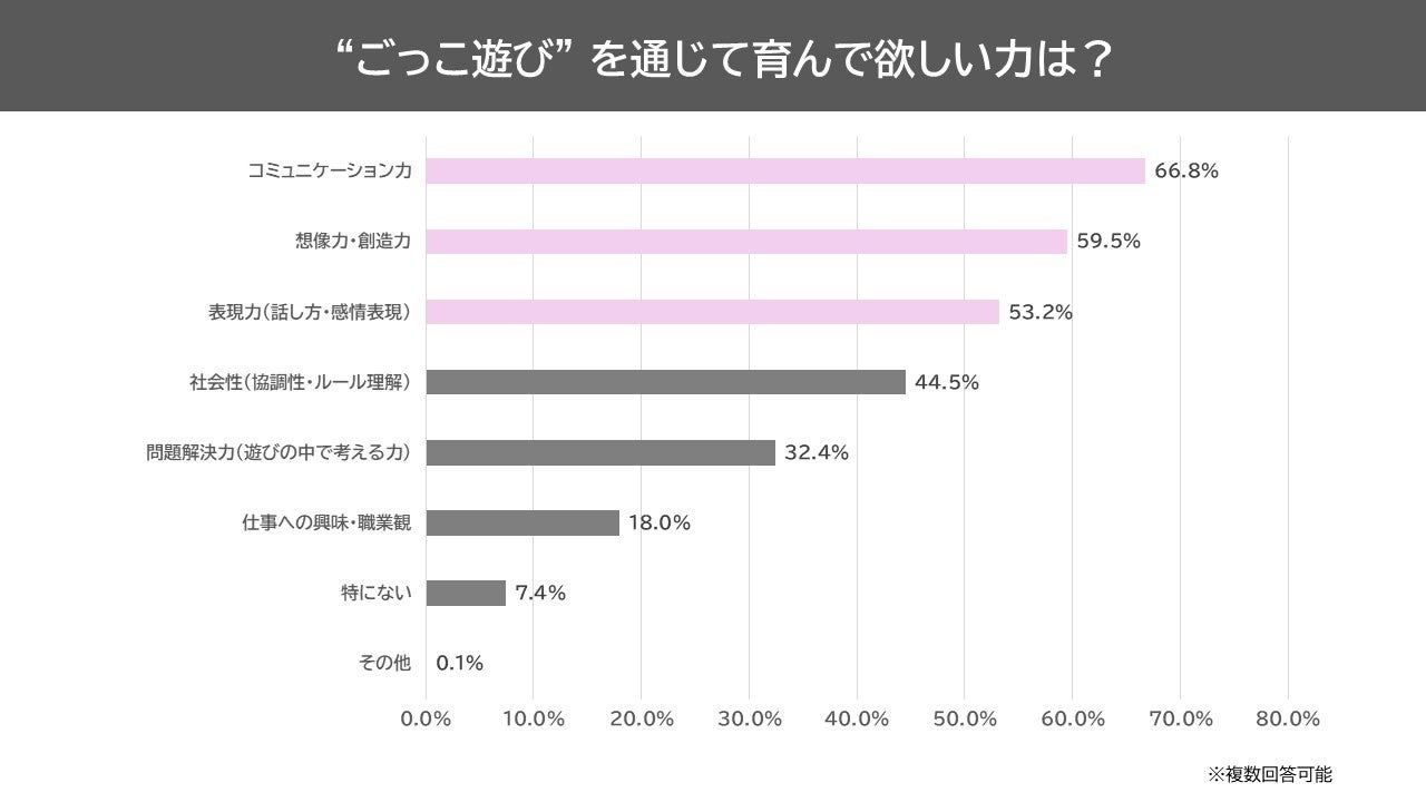 また、子どもに“ごっこ遊び”を通じて育んでほしい力としては、「コミュニケーション能力」(66.8%)「想像力・創造力」(59.5%)「表現力(話し方・感情表現)」(53.2%)が上位に挙がっており、人との関わりや自分を表現する力への関心が高いことがうかがえます。