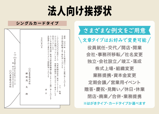 あらゆるビジネスの場で活用できる挨拶状。用途に合わせた文章、はがきのタイプをご用意しています。文章はお好みに合わせて変更可能です。