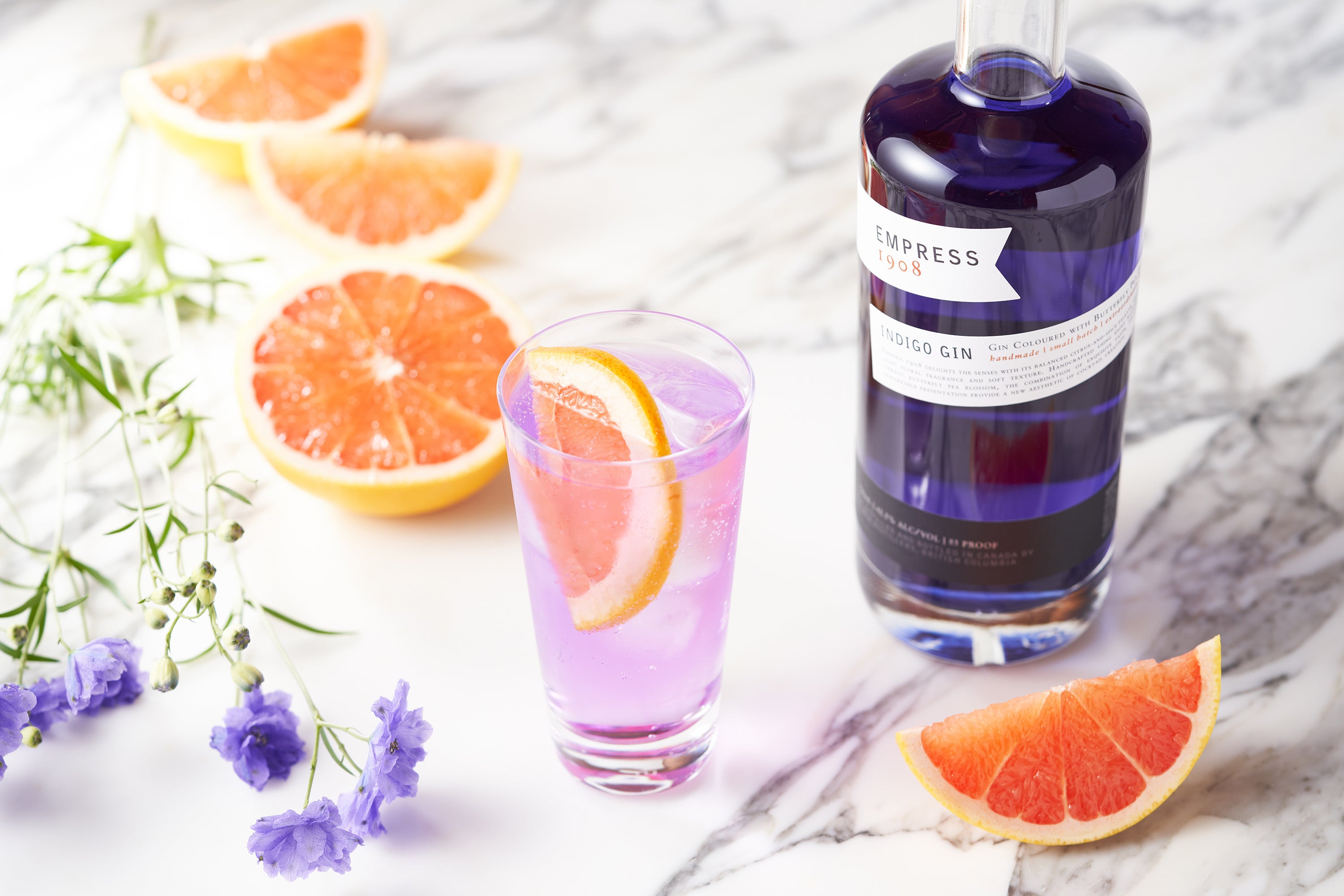 クラフトジンは、美しいインディゴブルーから、トニックを加えることで淡いピンクに色が変わるカナダ産のマジカルジン「EMPRESS 1908」をご用意。この色合いの変化はバタフライピー由来のものであり、そのほかのボタニカルも全て天然素材で作られています。