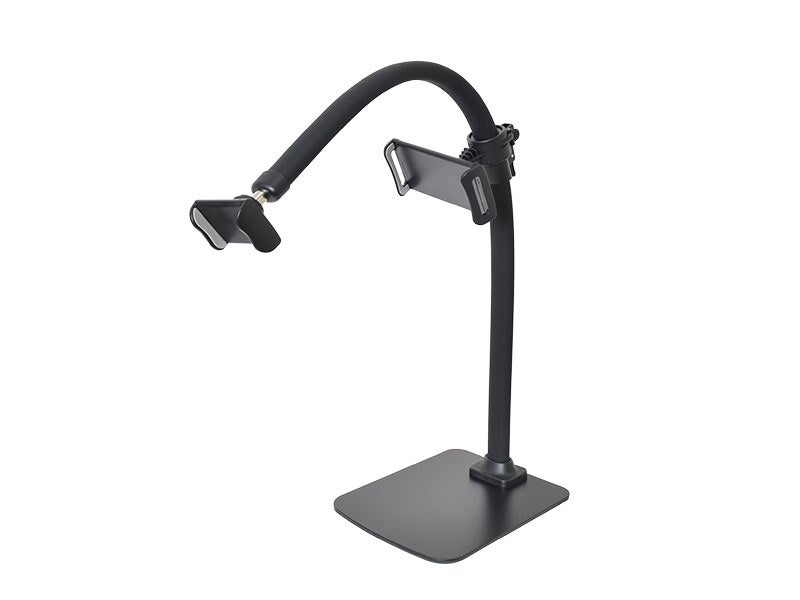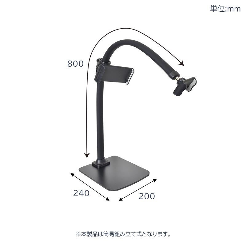 本製品はスマートフォンやタブレットを寝ながら持たずに使えるスマホタブレットアームスタンドです。幅200×奥行240×厚み4mmの土台と全長800mmのグネグネと曲げられるアーム。アームに