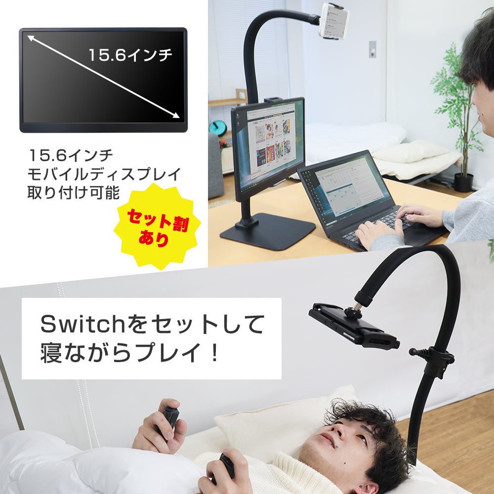 取り付けてどこでも好きな位置に固定できるアタッチメントとアーム先端部に取り付けるアタッチメントが付属。スマホホルダー、タブレットホルダーをアタッチメントにセットしてお好きな場所で使うことができます。アームは独自の楕円形状のオーバルホールディングシステムを採用。従来のホルダーにありがちな、重いものをセットした際にグラグラと不安定になってうまく固定できない。を解消しました。クリップのように指でつまむだけで360度スムーズに回転し、指を離せば強固を実現。15.6インチのモバイルディスプレイやNintendo Switchをホルダーにセットして使うことも可能。