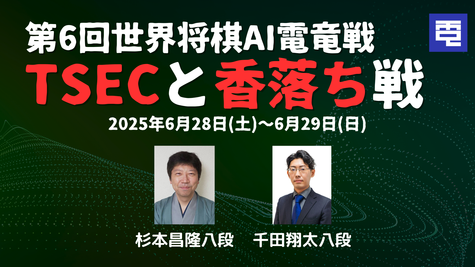 特定非営利活動法人AI電竜戦プロジェクト(理事長:松本 浩志)は、第6回電竜戦TSEC指定局面と香落ち戦を2025年6月28日(土)~6月29日(日)に開催いたします。TSECは指定局面戦を表し、通常の将棋の対局である平手と異なり指定した局面から対局開始となることで将棋AIの応用力がとわれるものとなります。さらに今回は将棋AIとは初めてとなる「香落ち戦」の大会もおこなわれる歴史初となる取り組みです。