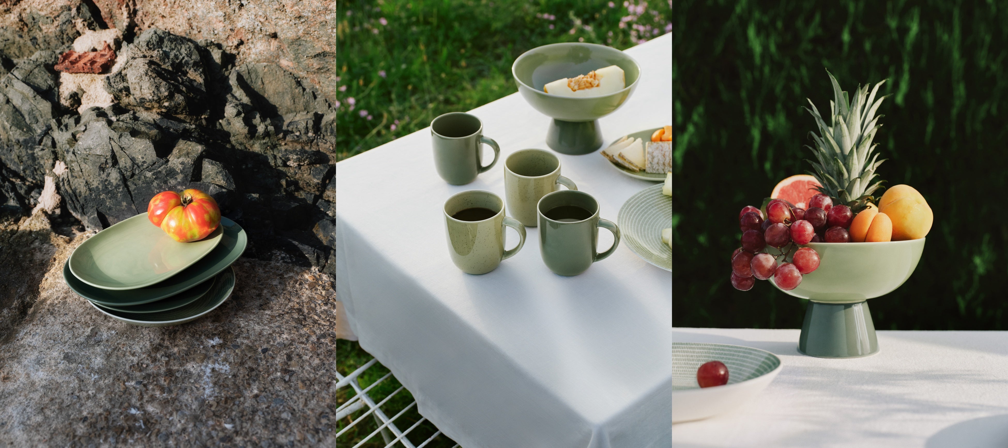 新作アイテムでは、地中海の風や自然光、水面のゆらめきから着想を得たセージグリーンやエバーグリーンなどの新色が登場します。これらのグリーンは、30年前に誕生したオリジナルコレクションのカラーへのオマージュとして再解釈されたものです。透明感のある質感が器に奥行きのある豊かな表情をもたらし、やわらかなフォルムをより一層引き立てます。