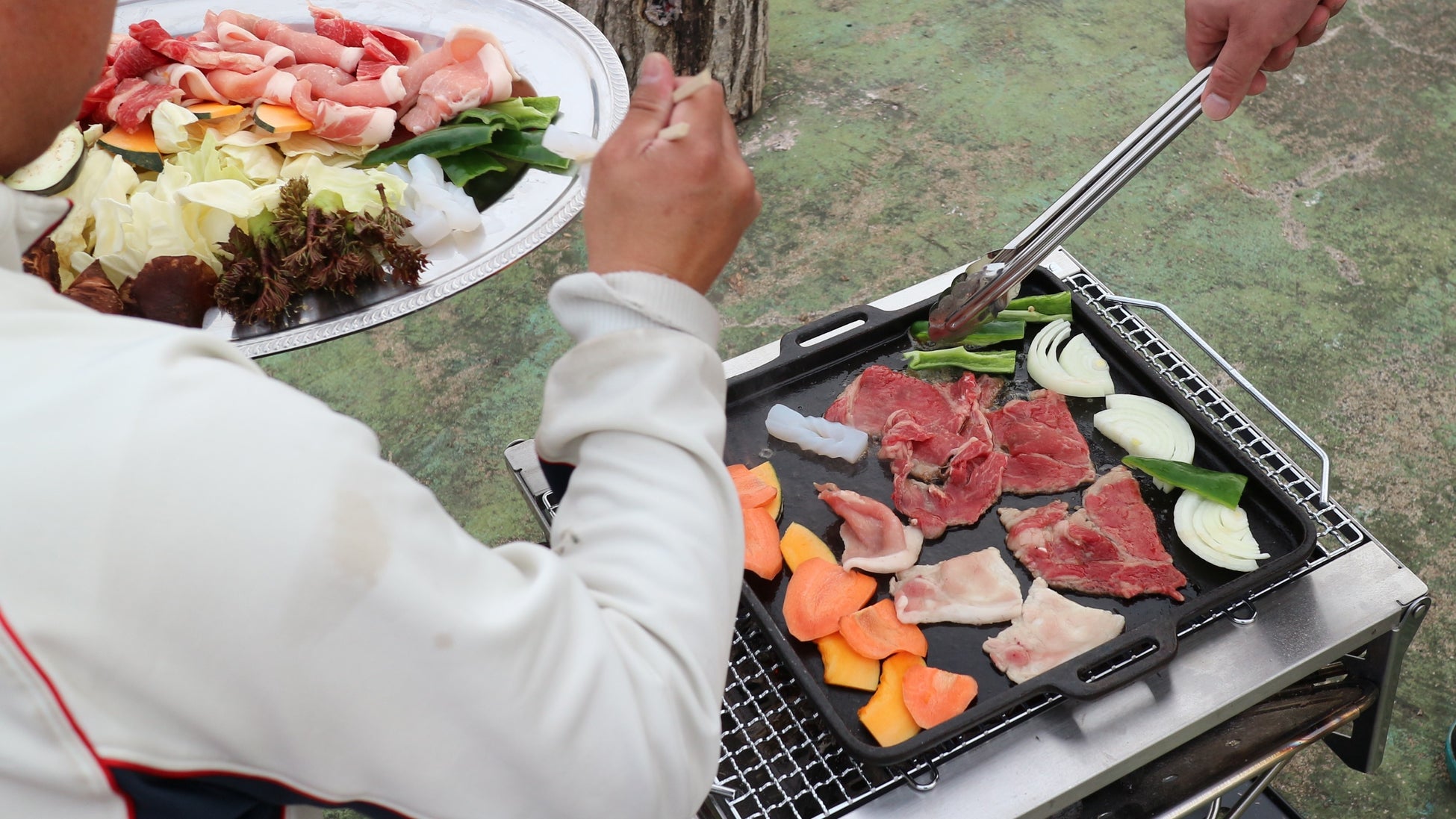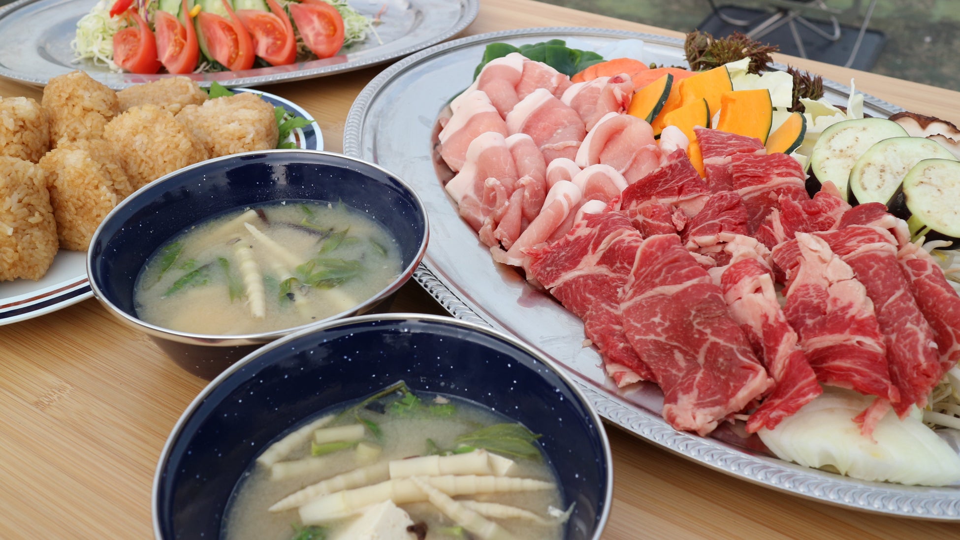 BBQ食材はプランに含まれており、地産地消の食材をふんだんに使用しています。常設している山形名物の「いも煮&BBQプラン」、天元台高原で収穫される竹の子を使用した「吾妻竹の子汁&BBQプラン」(期間限定、6月頃)がおすすめです。