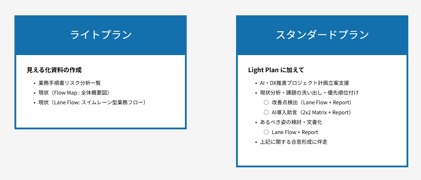 小さく始められるライトプランから本格的なDX推進に対応するスタンダードプランなど、お客様の体制・ご要望に応じて柔軟にサービスを提供いたします。