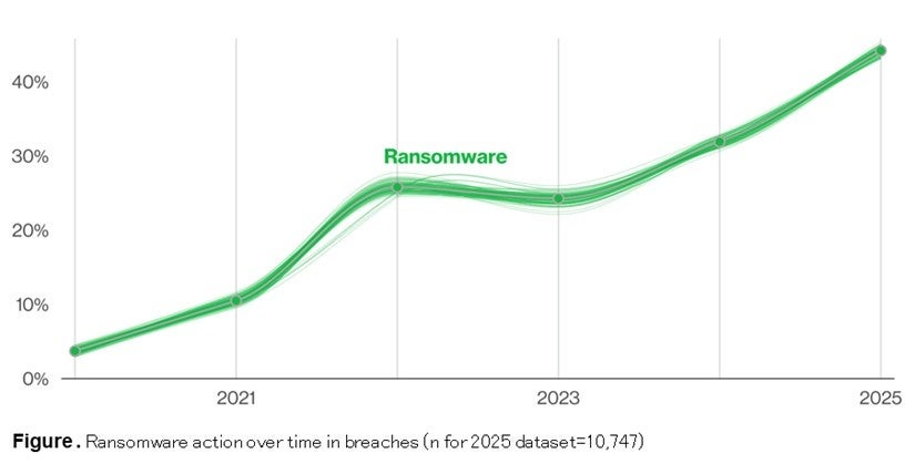2025年DBIRは業界別の傾向にも光を当て、製造と医療業界における諜報目的の攻撃の急増、教育、金融、小売業界への継続的な脅威を明らかにしました。報告書はまた、ランサムウェアが中小企業(SMB)に与える不均衡な影響にも言及しています。