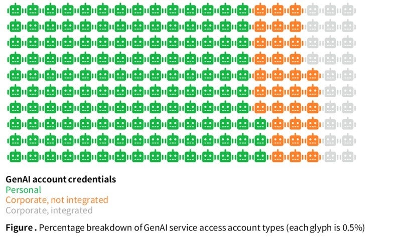 従業員の15%が会社のデバイスで日常的に(少なくとも15日に一度)生成AIシステムにアクセスしているため、企業機密データがGenAIプラットフォーム自体に漏洩する可能性があります。