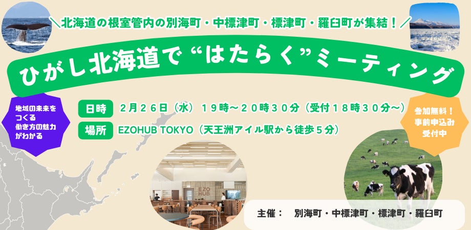 北海道の根室管内の4町(別海町・中標津町・標津町・羅臼町)が集結し、2月26日(水)東京・天王洲アイル「EZOHUB TOKYO」で、オフラインイベントを開催。地域で“はたらく”魅力を発信します。