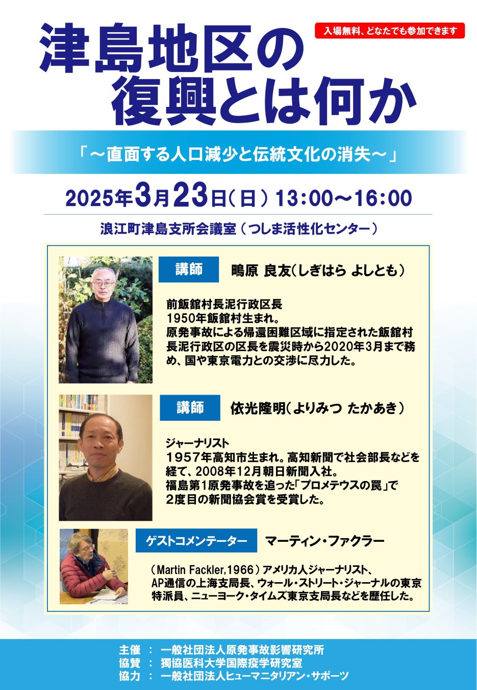 講師として飯舘村帰還困難地区の前区長の鴫原良友さん、元朝日新聞特別報道部長の依光隆明さん、ゲストコメンテーターとして元ニューヨーク・タイムズ東京支局長のマーティン・ファクラーさんをお招きし、司会進行は当法人の木村真三(獨協医科大学 国際疫学研究室 准教授)が務めます。
