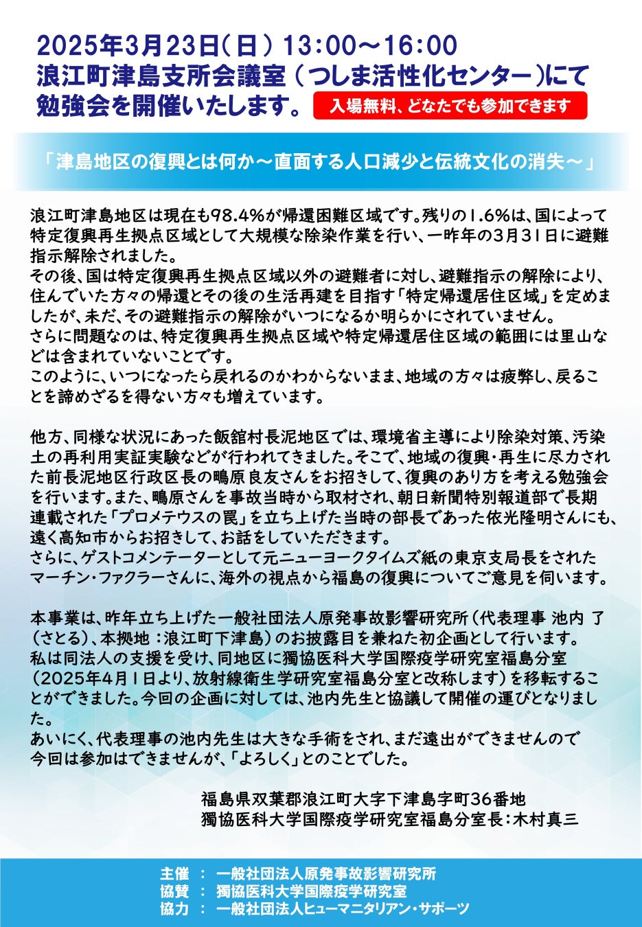 主催 : 一般社団法人原発事故影響研究所