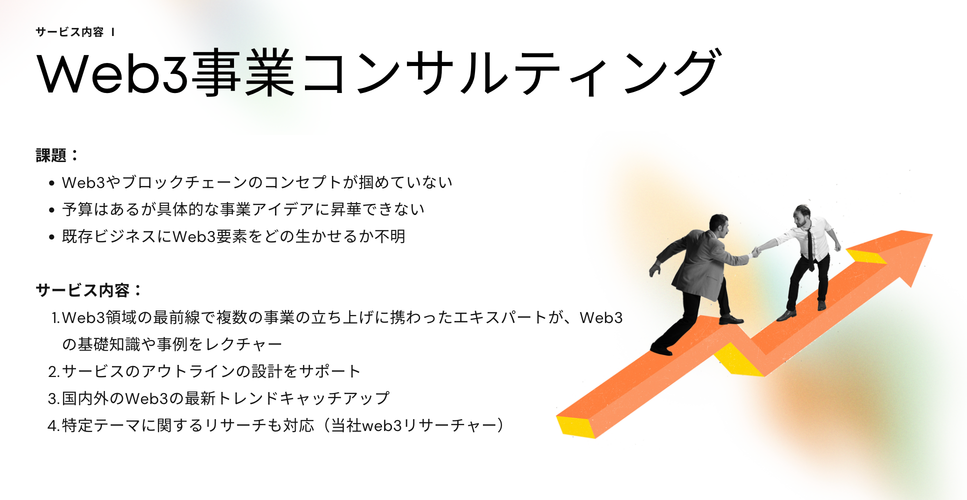 ・Web3、ブロックチェーン領域のキャッチアップ・リサーチフェーズにある企業や、具体的な事業構想を固めたい企業に向け、web3ドメインエキスパートの視点と知見からコンサルティングを行います。ビジネス上必須となる業界知識や成功事例などを通じてケーパビリティの獲得を伴走支援します。