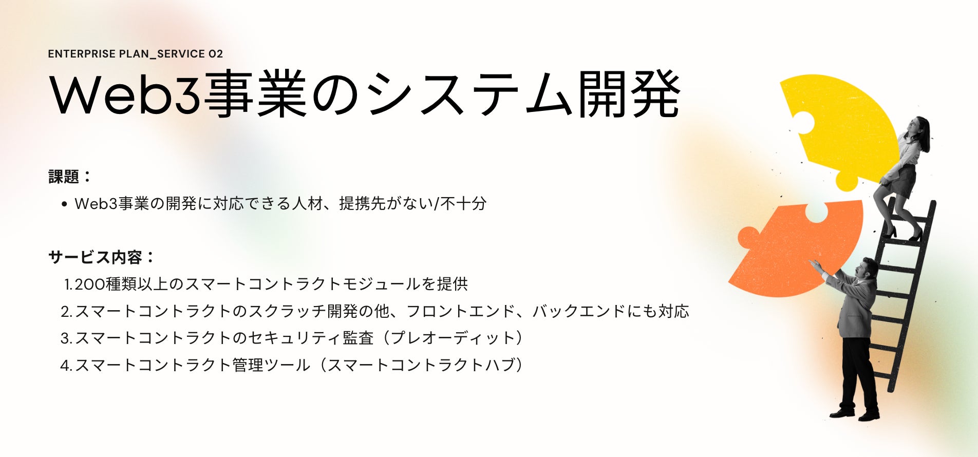 ・Web3事業のシステム開発に対応できる人材や提携先が不足している企業へ向け、BunzzのWeb3エンジニアチームが開発をサポートします。アジア最大級の開発インフラ「Bunzz」が蓄積してきた200種類以上のスマートコントラクトのテンプレートも利用可能。
