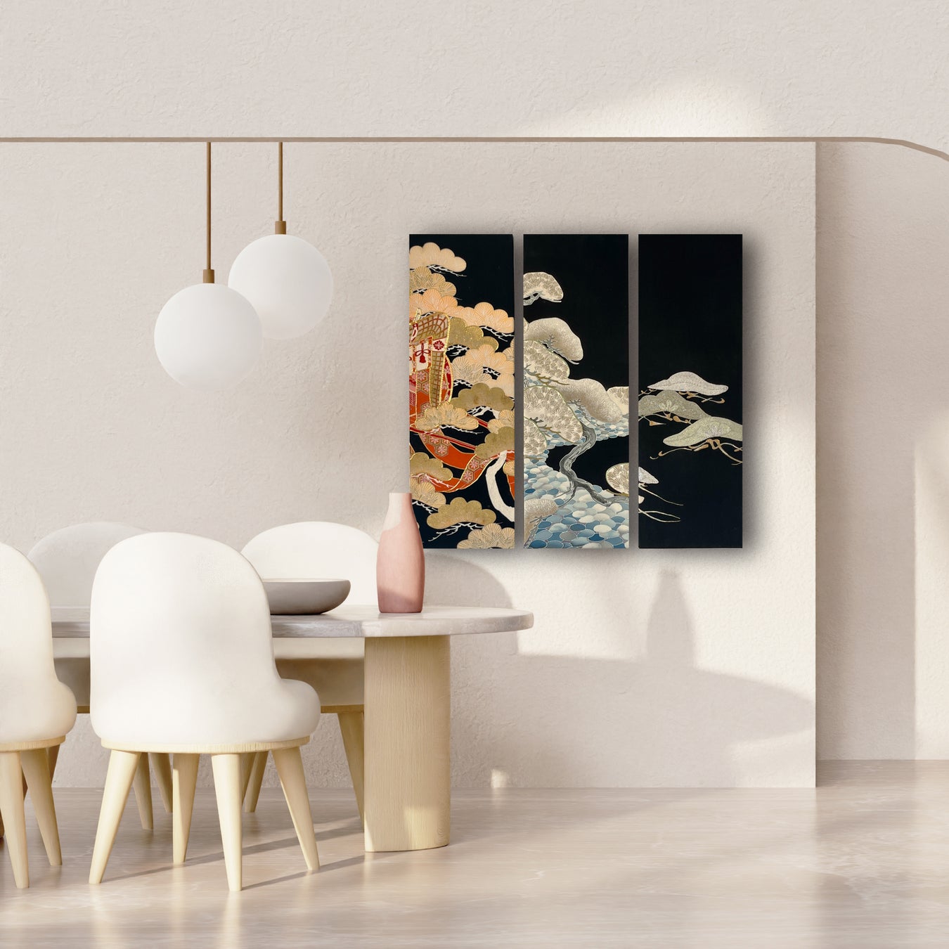 Kimonos are often referred to as "wearable art," made using traditional Japanese techniques, with each one meticulously woven, dyed, embroidered, and decorated by hand. "ikasu" takes these one-of-a-kind works, respecting their history, craftsmanship, patterns, and stories, and transforms them into art pieces that shine even more in modern spaces.