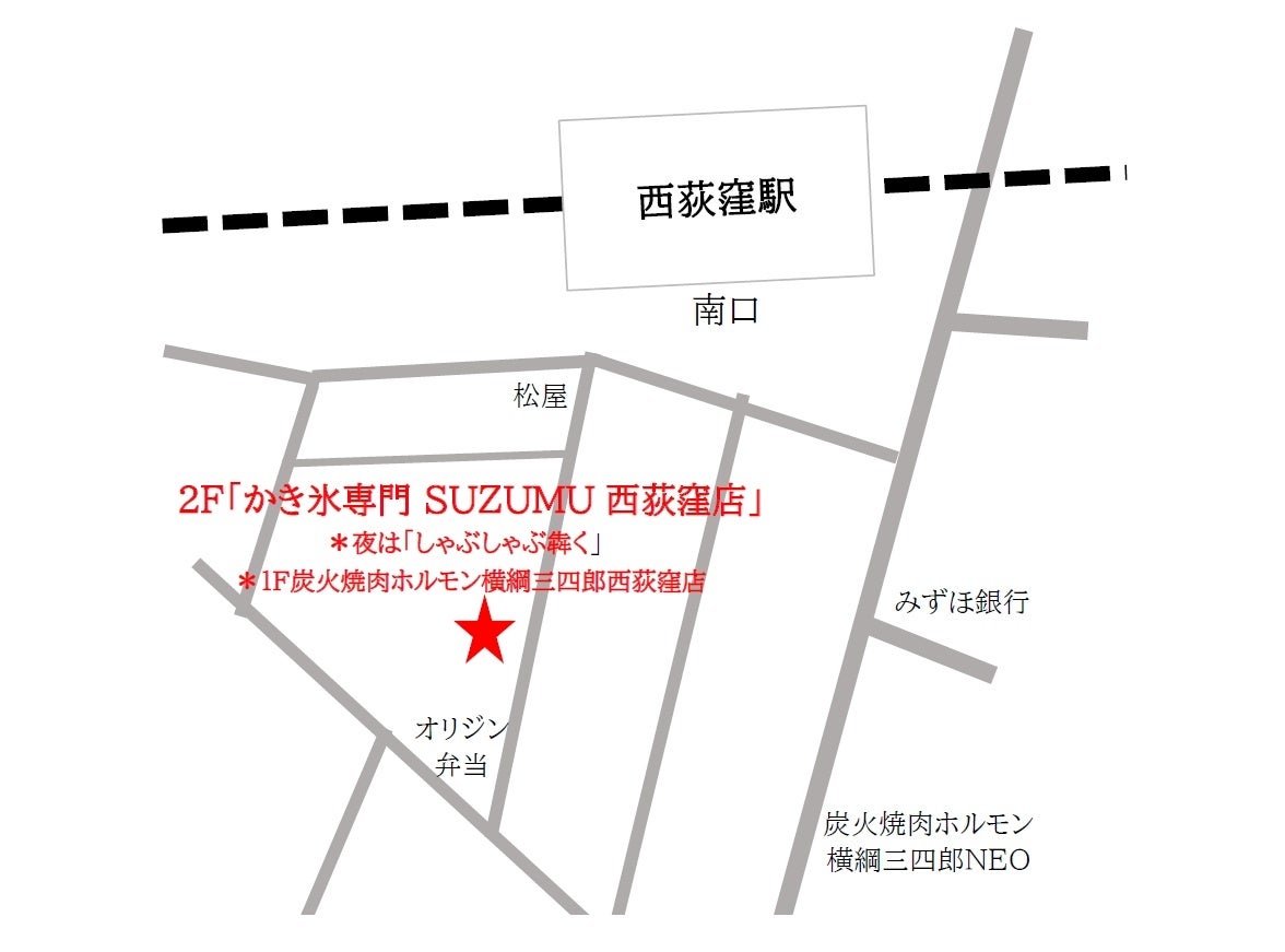 中央・総武線西荻窪駅から徒歩1分、「炭火焼肉ホルモン 横綱三四郎 西荻窪店」内階段を2階へ上がった、「しゃぶしゃぶ 犇く(ひしめく) 西荻窪本店」の場所で、夏季の土日祝11時から17時までの営業時間で、期間限定店舗「かき氷専門 SUZUMU 西荻窪店」を2025年4月26日にオープン。