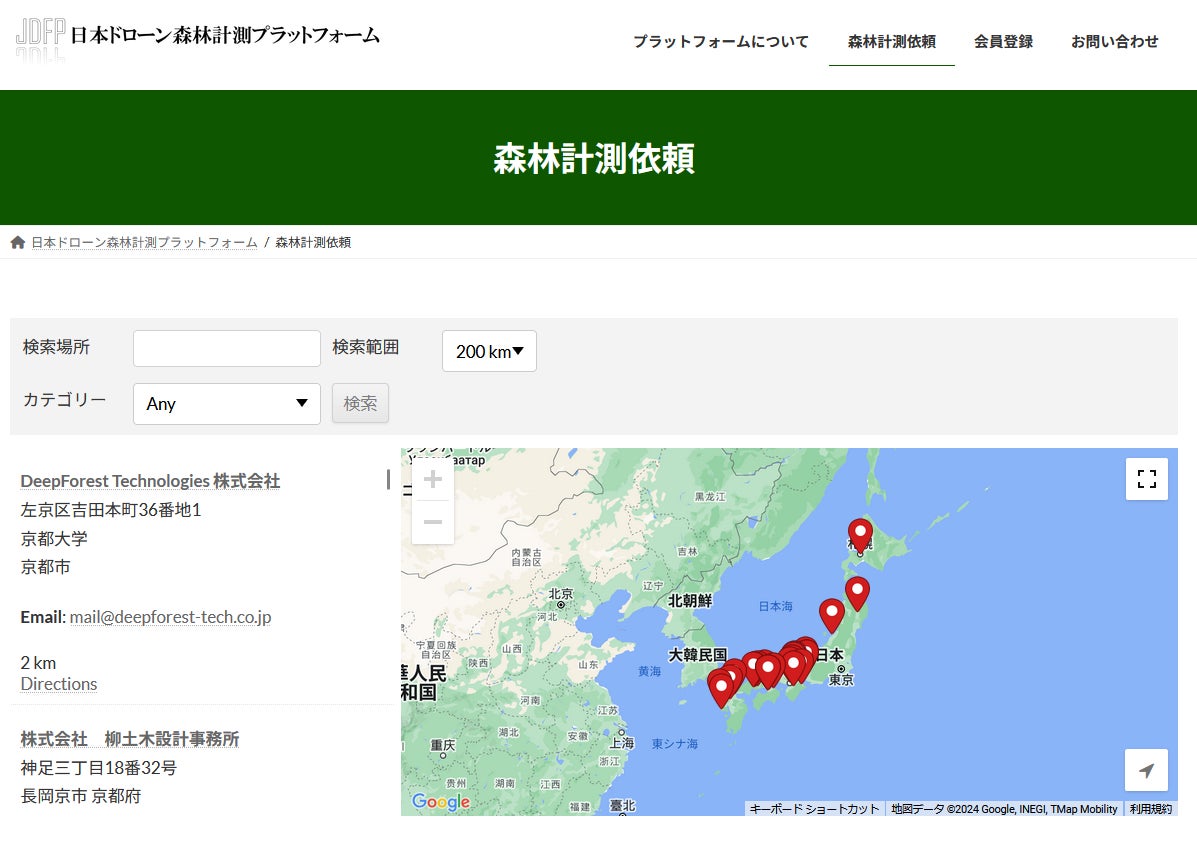 プラットフォームでは現在地や計測対象地などを指定することで、近くの登録企業や支店を検索することが可能です。そのため、各地域で最寄りの測量会社に依頼することができ、最適なコストでの森林計測や解析依頼が可能となります。