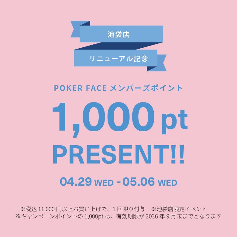 オープニングを記念し、対象期間中にPOKER FACE池袋店にて11,000円以上のお買い物をいただいたPOKER FACEメンバーズ会員のお客様に、期間限定の特別ポイントをプレゼントいたします。