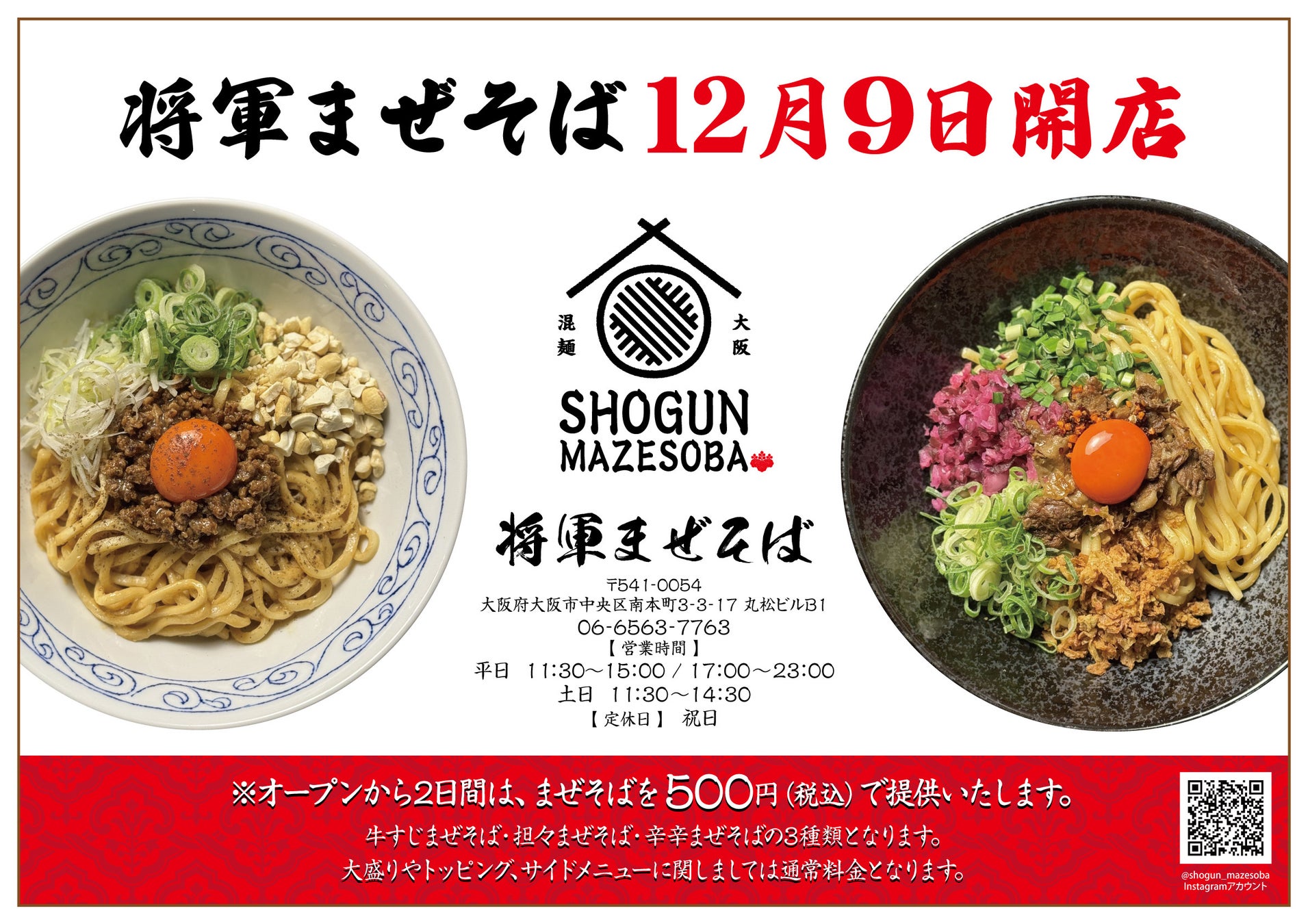【大阪・本町】「将軍まぜそば」12/9(月)リニューアルオープン記念!人気メニューを含む3種のまぜそばをワンコインでご提供!
