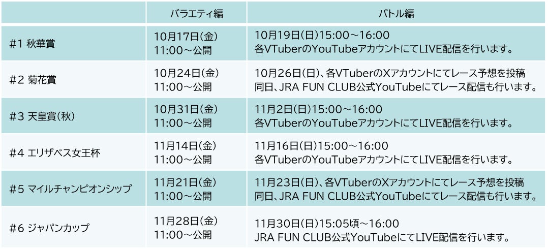 その後のバトル編では、各メンバーが実際のGⅠレースを真剣に予想。全6レースで着順に応じて与えられるポイントの合計を競い合います。予想の模様は、各VTuberのYouTubeチャンネルやXアカウントにて発信いたします。