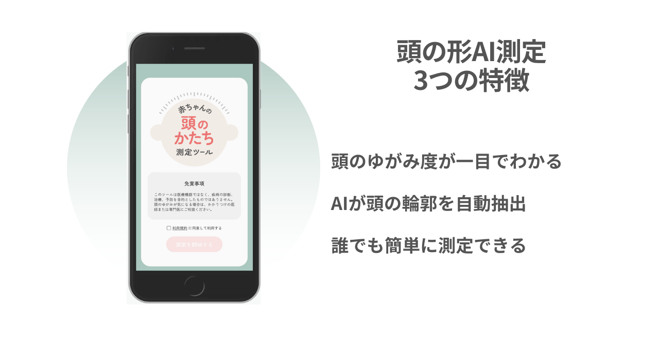 頭の形がゆがんでいるかも?と思ってもなかなか自宅で測ることは難しい。そんな時に、「頭のかたちAI測定」をご活用いただければ、手軽に赤ちゃんの頭のゆがみ度を可視化でき、ひと目でわかります。