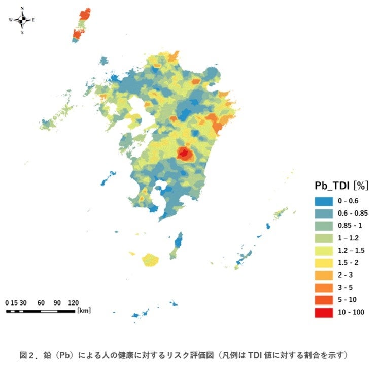 図1と2は、TDI値を指標としたそれぞれヒ素と鉛の人への影響の評価結果を示します。リスクの有無は、上記の暴露経路に一般的な食料品(乳製品や魚介類、肉類など)などからの摂取も加えて、TDI値の10%を超えれば対象元素摂取によるリスクが懸念され、下回ればリスクがないと判断しました。