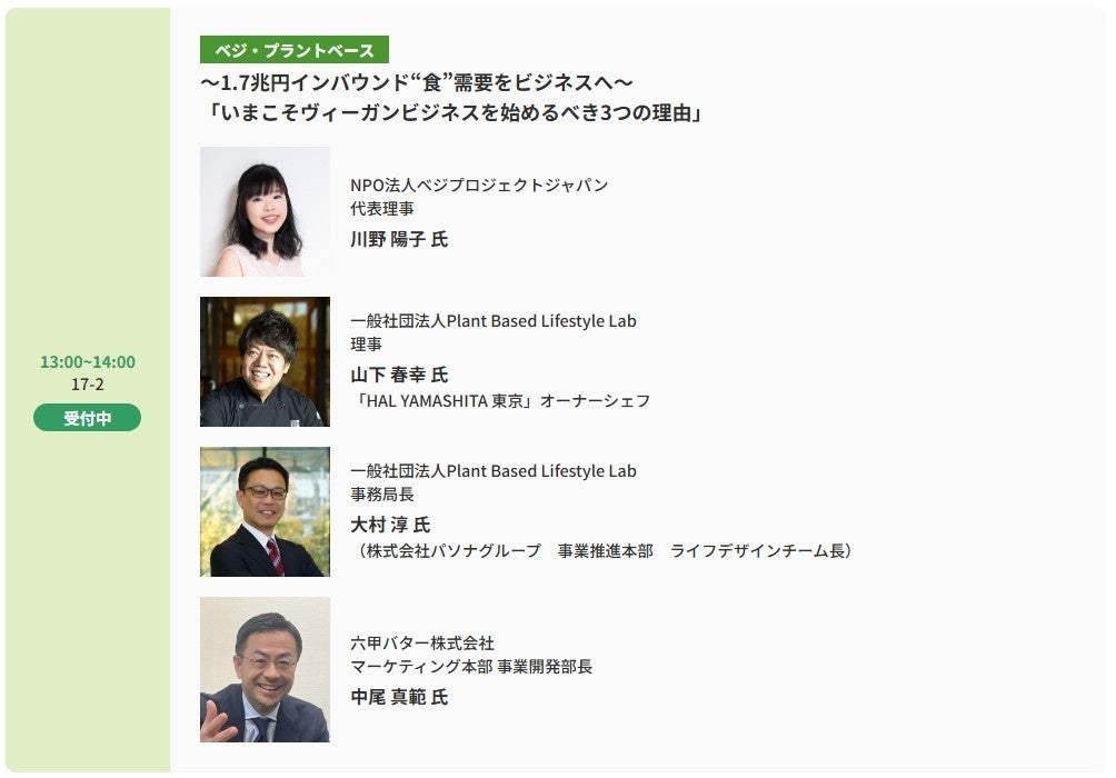 4/17㈭13:00からは、「~1.7兆円インバウンド”食”需要をビジネスへ~『いまこそヴィーガンビジネスを始めるべき3つの理由』」と題した、ヴィーガン市場に関するビジネスセミナーが開催されます。パネルトーク形式の本セミナーに、ベジプロジェクト代表の川野陽子(かわのはるこ)も登壇します。