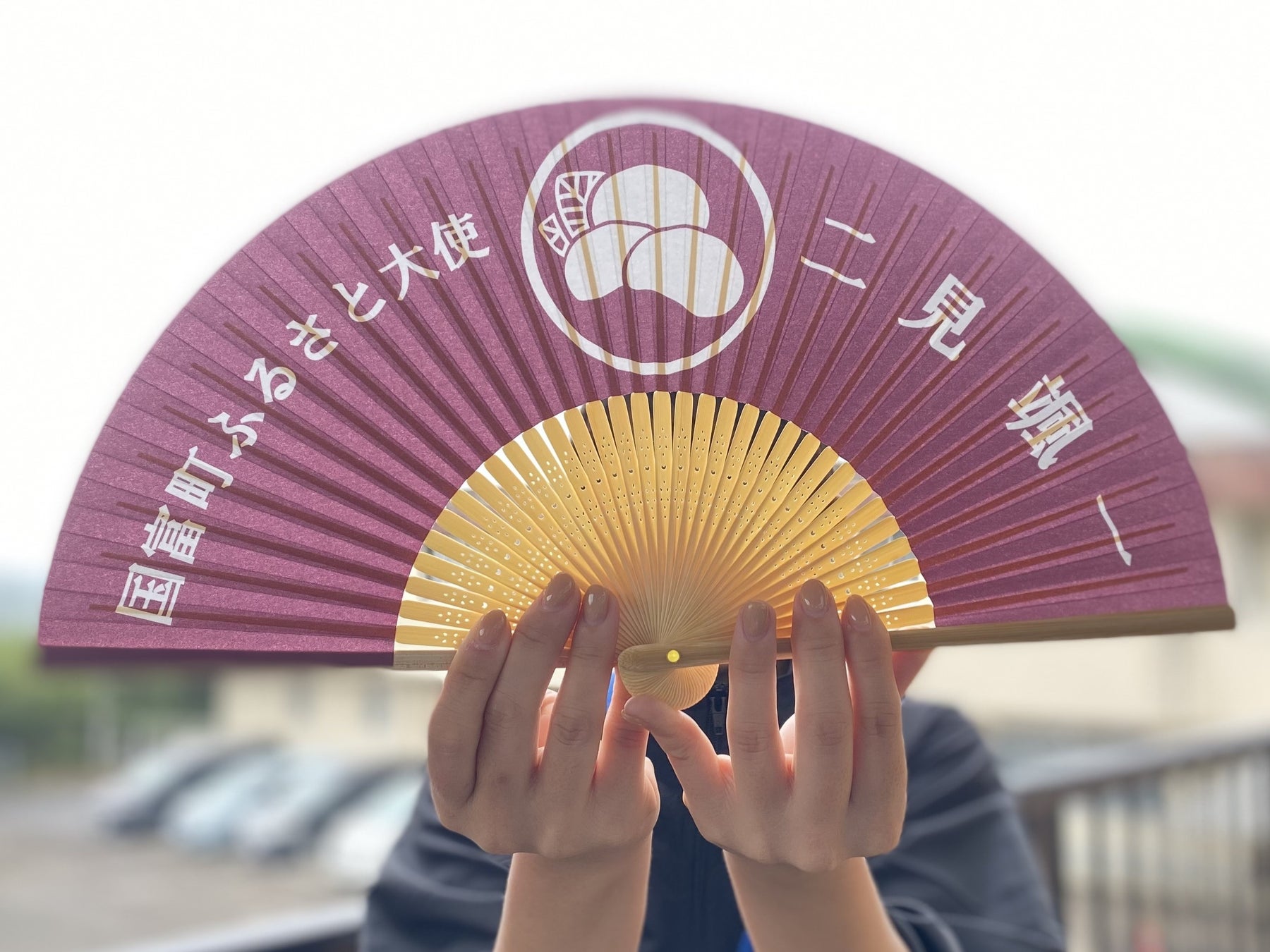 国富町ふるさと大使の二見颯一さんだけが携帯できるえんじ色のせんす。中央のイラストは、二見さんがこのせんすのためだけに特別に描きおろした国富町名物の「白玉まんじゅう」が描かれている。ちなみにしらたマンはこの白玉まんじゅうをモチーフに生まれたキャラクターである。