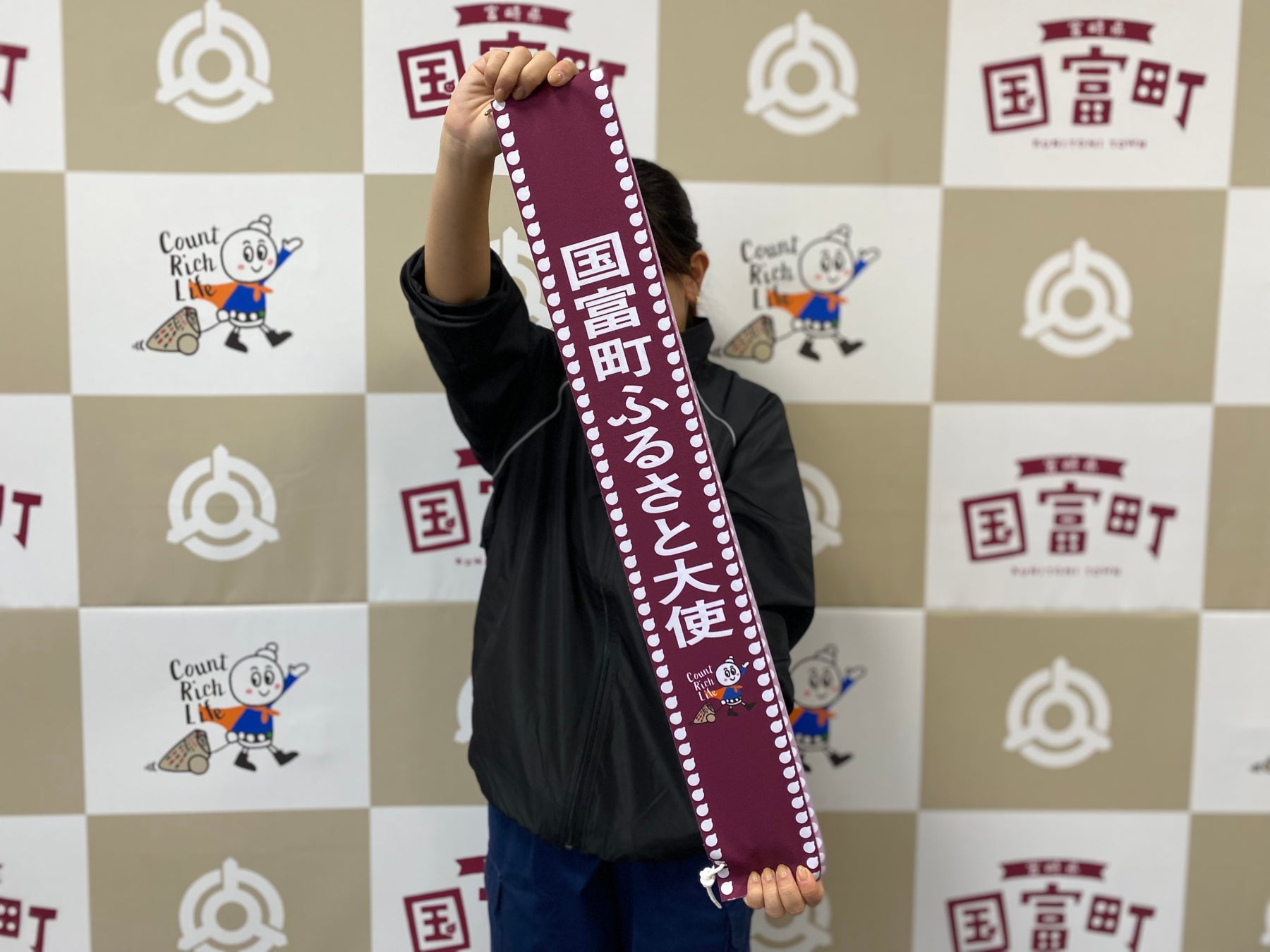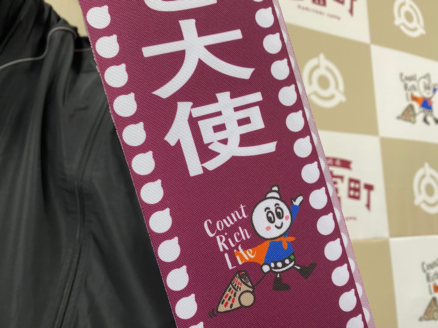 国富町ふるさと大使だけが着用を許されるえんじ色のたすき。縁取りのドット柄は、よく見ると同町のイメージキャラクター「しらたマン」のシルエットになっている。