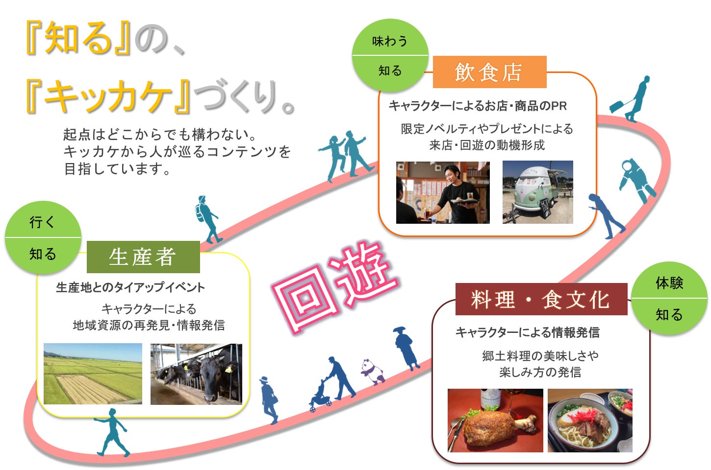 生産者と飲食店、消費者をつなぐキャラクター『カルビちゃん』によるお肉というテーマ性を明確に表現し、羽曳野市の特産品や食文化をリンクさせ、各方面へPRを行うことにより人々の「これを食べたい!」を具体化、羽曳野市への訪問者数を増やし、食べ歩きニーズの掘り起こしを行います。