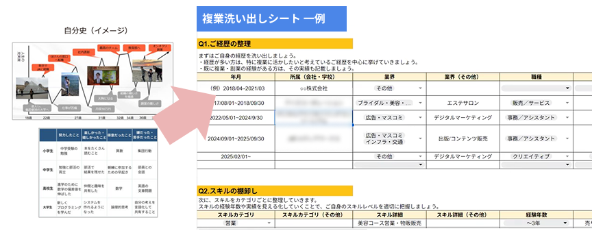 単なる年表作成に留まらず、過去の成功体験や挫折、私生活での大きな転機(出産、育児、趣味への没頭など)を徹底的に棚卸しします。一見ビジネスとは無関係に思える経験から「自分にしか出せない価値」を抽出し、育児で培ったマルチタスク能力や、スポーツで得た目標設定能力・判断力などのポータブルスキルを、具体的なビジネススキルへと紐付けて言語化します。