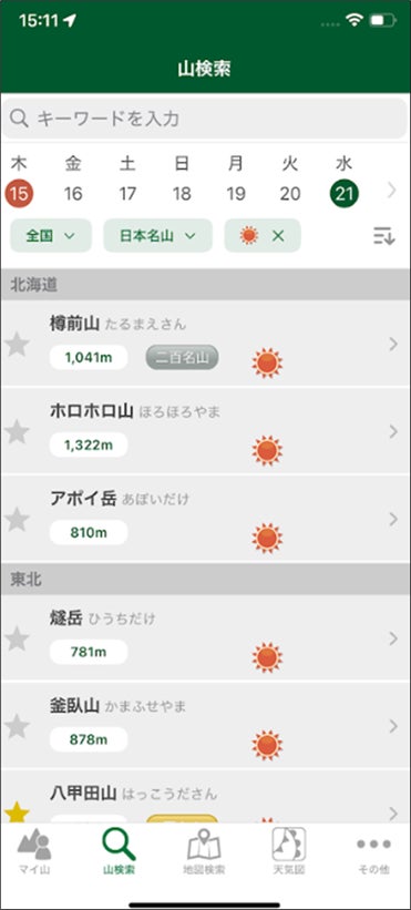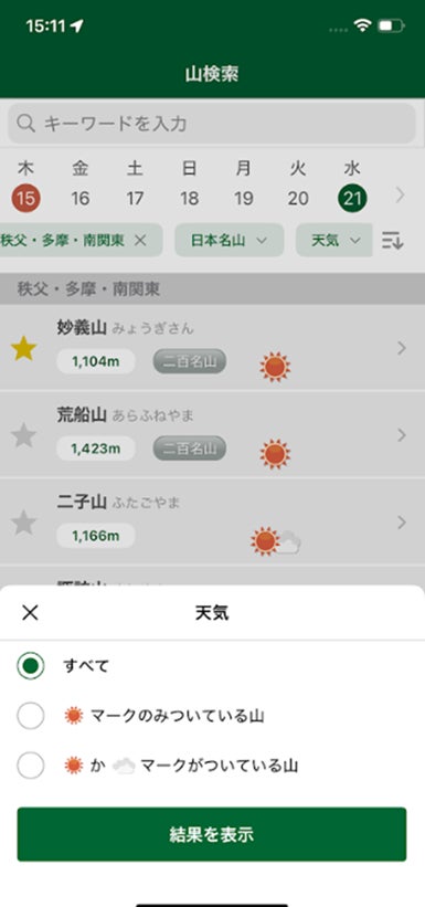 それぞれのソート機能は複数選択ができ、ソート結果に表示された山を標高の高い順、標高の低い順、山名順で並べ替えられるほか、当日含めて2週間分の日付指定も可能なため、希望に合った山を見つけることができます。