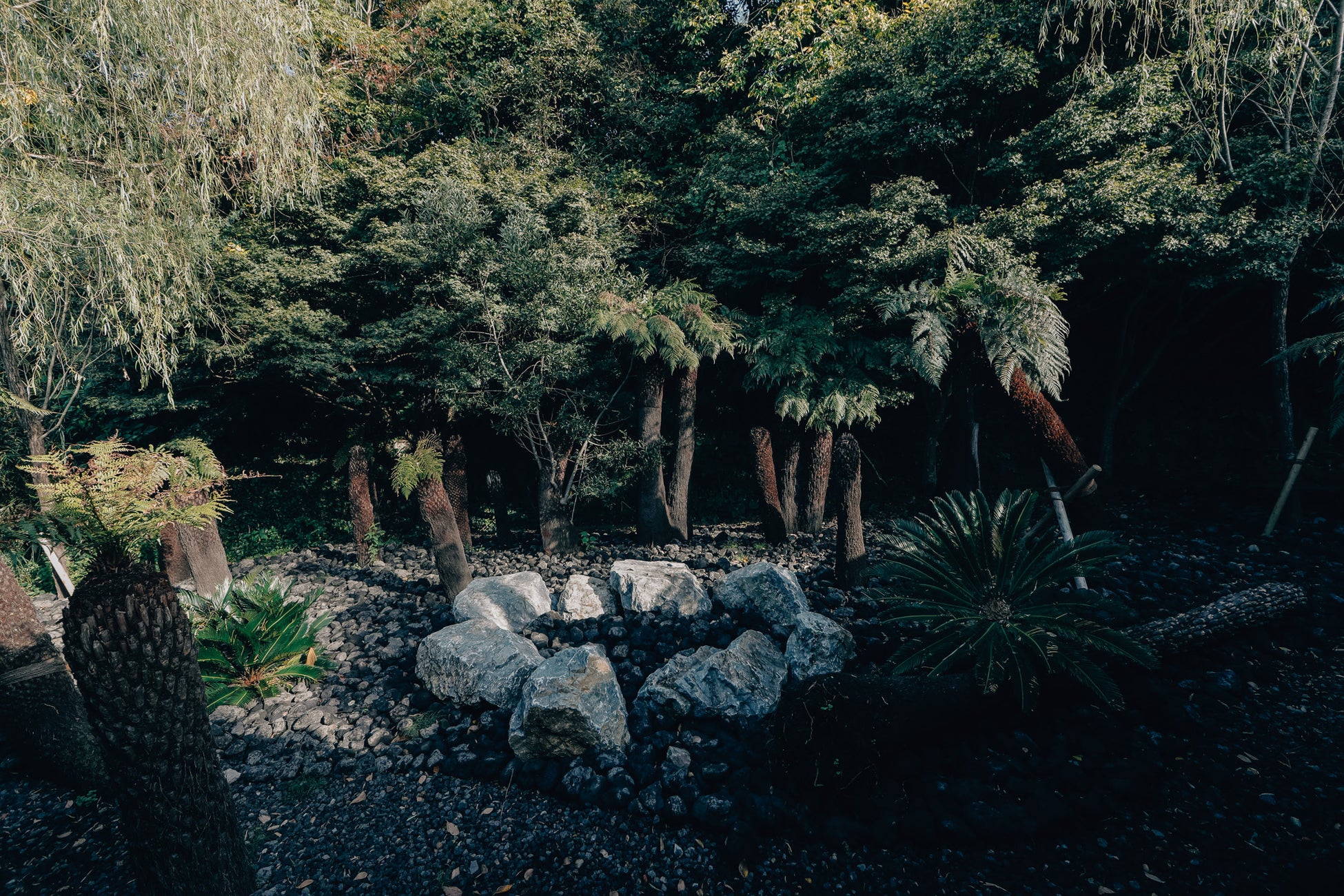「SWEAT LODGE」に併設する外気浴エリアには、シダやヘゴの木をはじめマイナスイオン感じる太古の植物たちが並びます。プールエリアとは反対に静寂な森を感じることのできるスポットです。