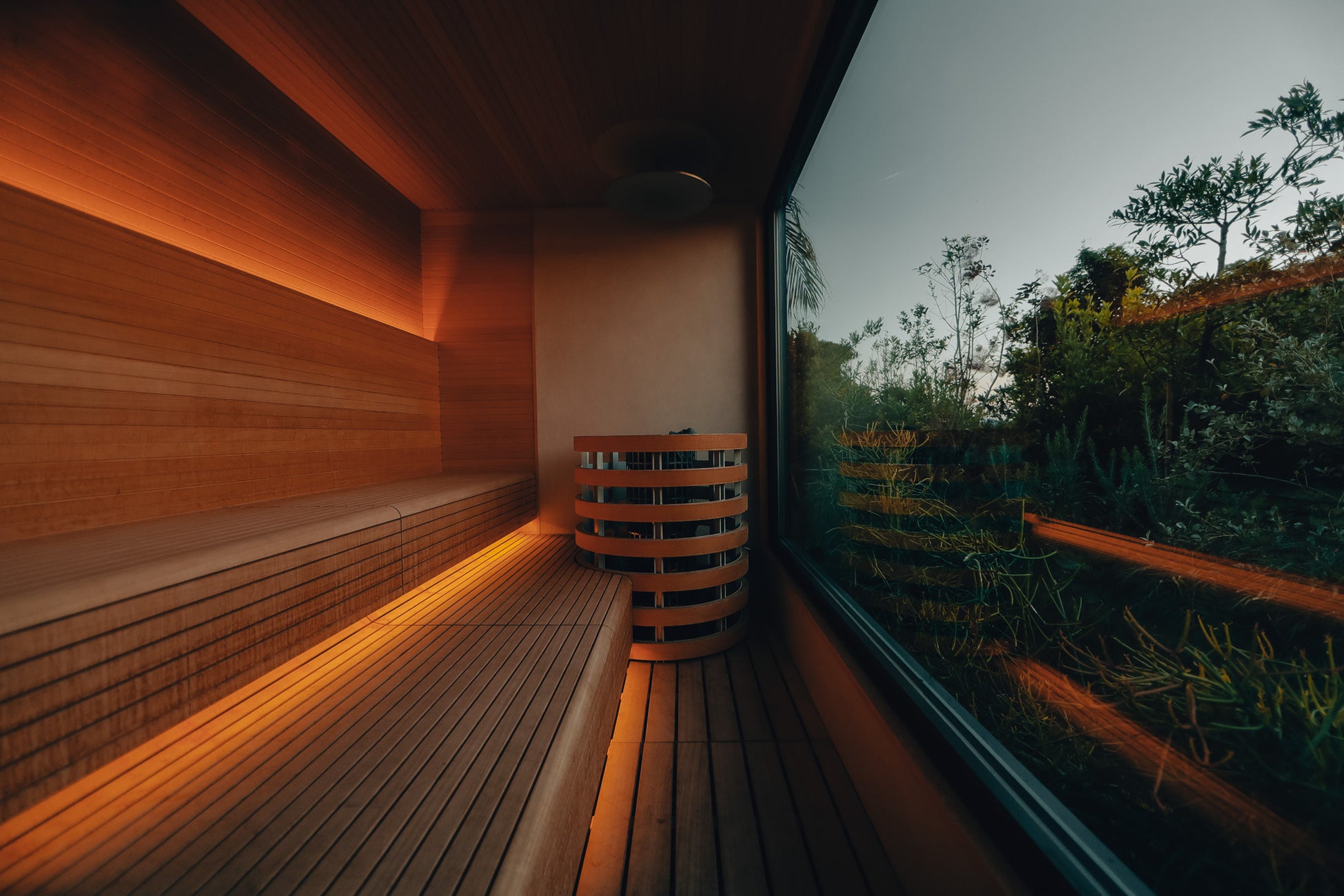 プールサイドに設置されたサウナ(室内温度100℃以上)では、全面ガラス張りの大きな窓からボタニカルビューを楽しめます。「HARVIA」のサウナストーブではセルフロウリュウが可能。サウナの後は、チラーで冷やされた冷水シャワーを浴びてプールにダイブするのもBPCならではの楽しみ方。