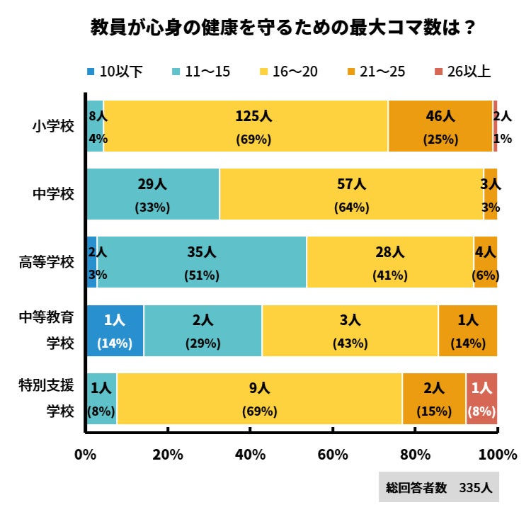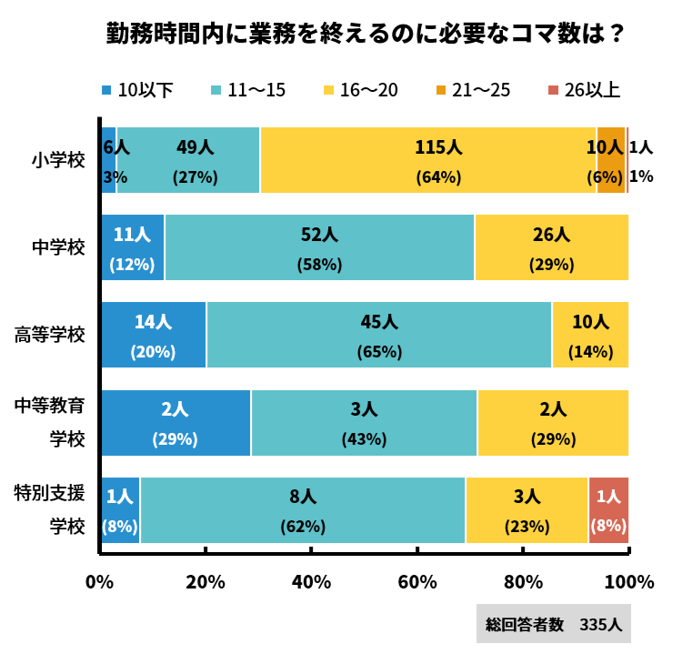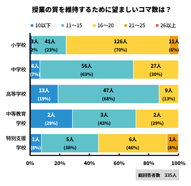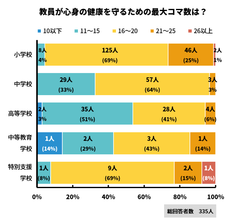 授業の質を維持するために望ましいコマ数は、小学校と中学校・高校で大きな違いが見られました。小学校では「16コマ以上20コマ以下」と回答した人が70%と最も多かった一方で、中学校では「11コマ以上15コマ以下」と回答した人が63%と最も多く、高校では68%でした。特別支援学校においては、「11コマ以上15コマ以下」と回答した人と「16コマ以上20コマ以下」と回答した人はほぼ同数でした。 |
