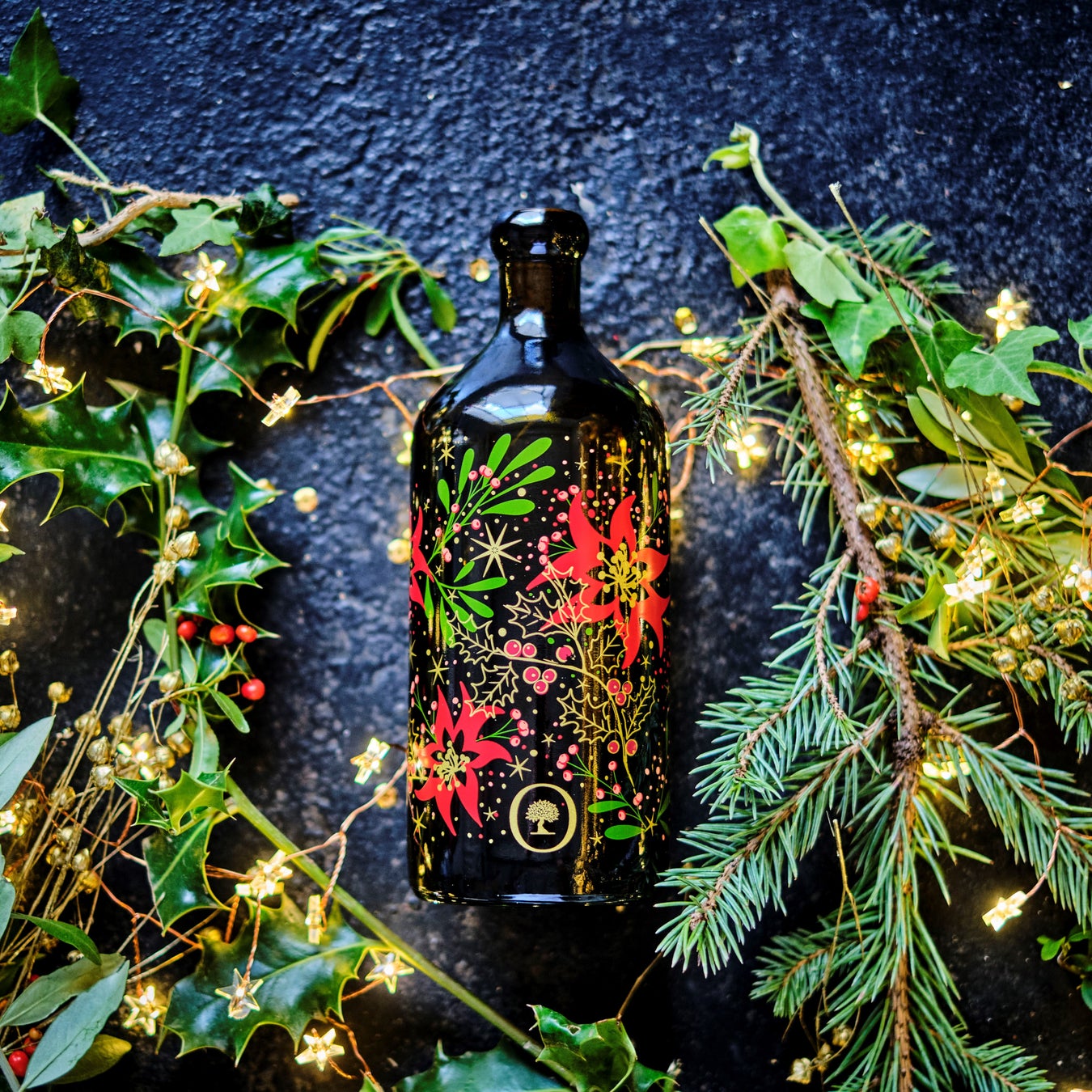 冬季限定デザインボトルは深緑、煌めく金、鮮やかな赤が織りなす植物モチーフで華やかに彩られ、テーブルに置くだけで心弾むクリスマスの雰囲気を演出します。