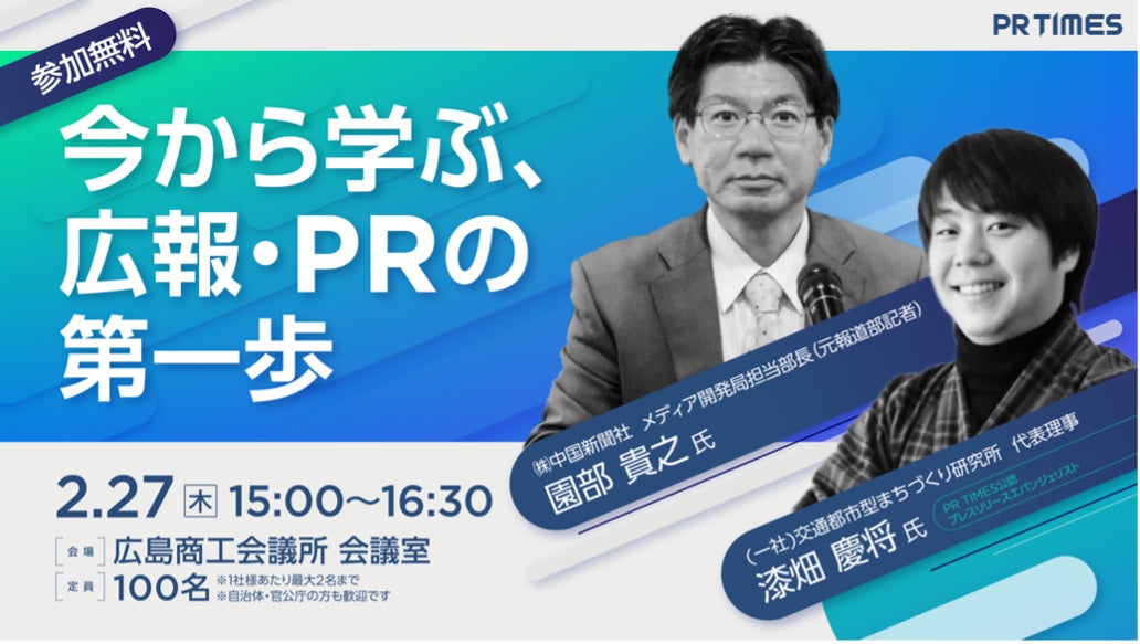 〜「今から学ぶ、広報・PRの第一歩」と題したセミナーを、広島事業者向けに2月27日15時から広島商工会議所にて実施〜