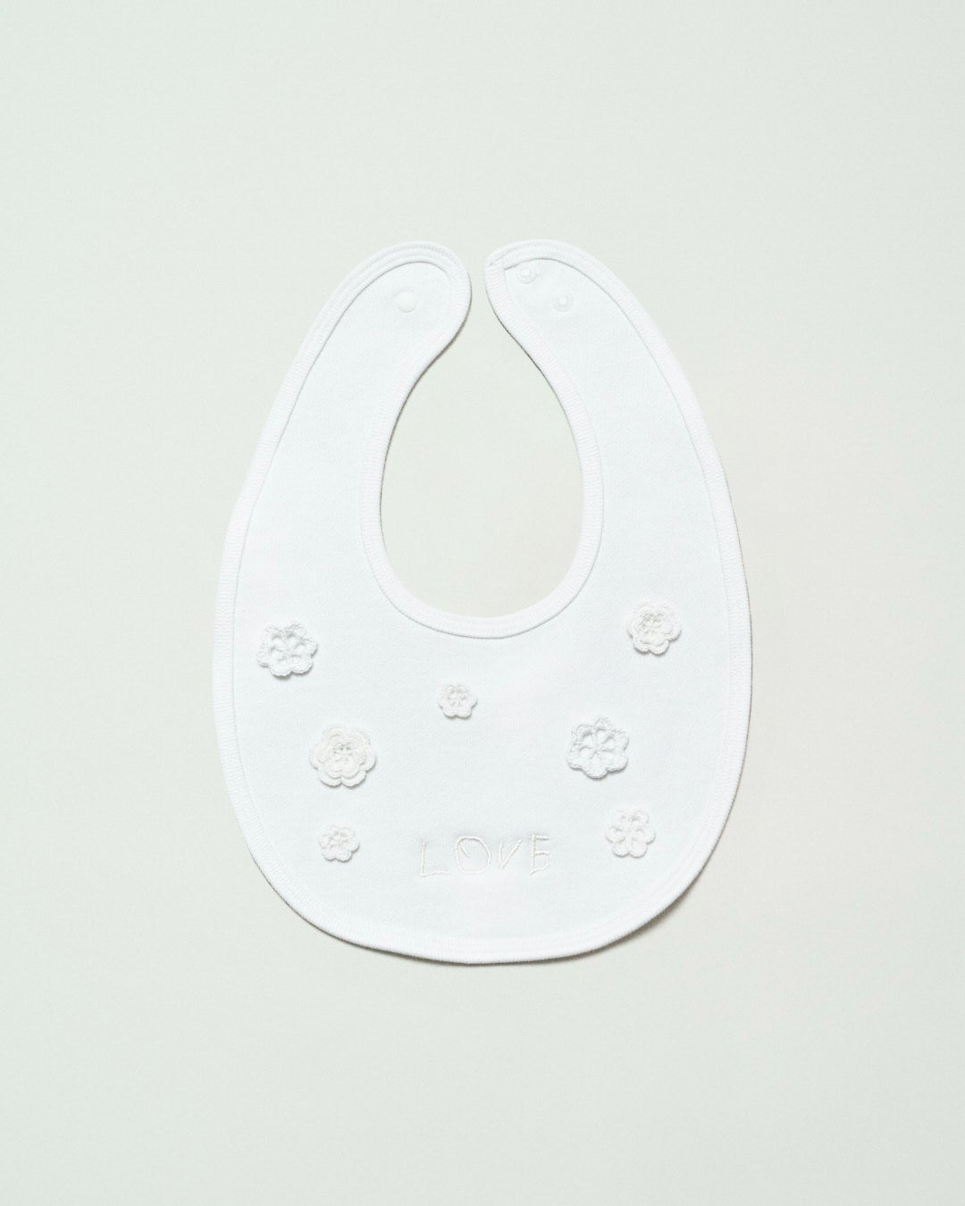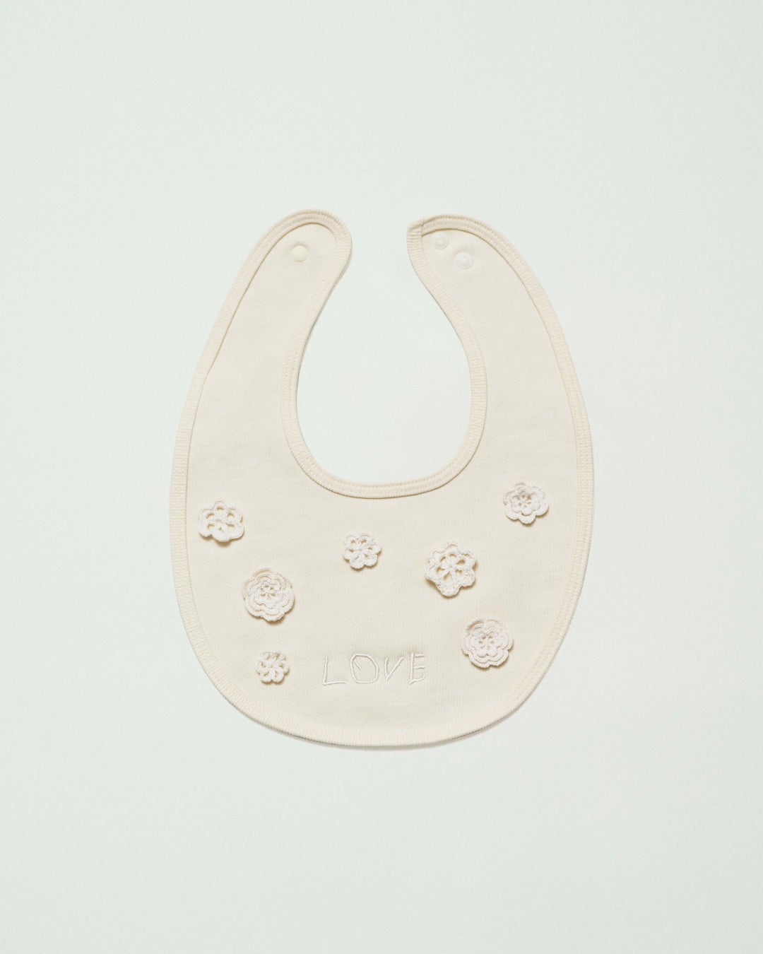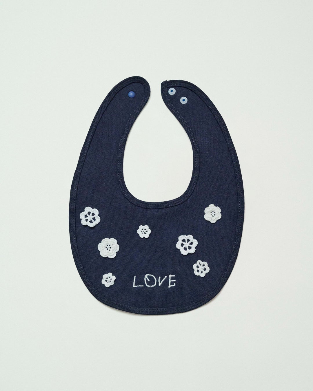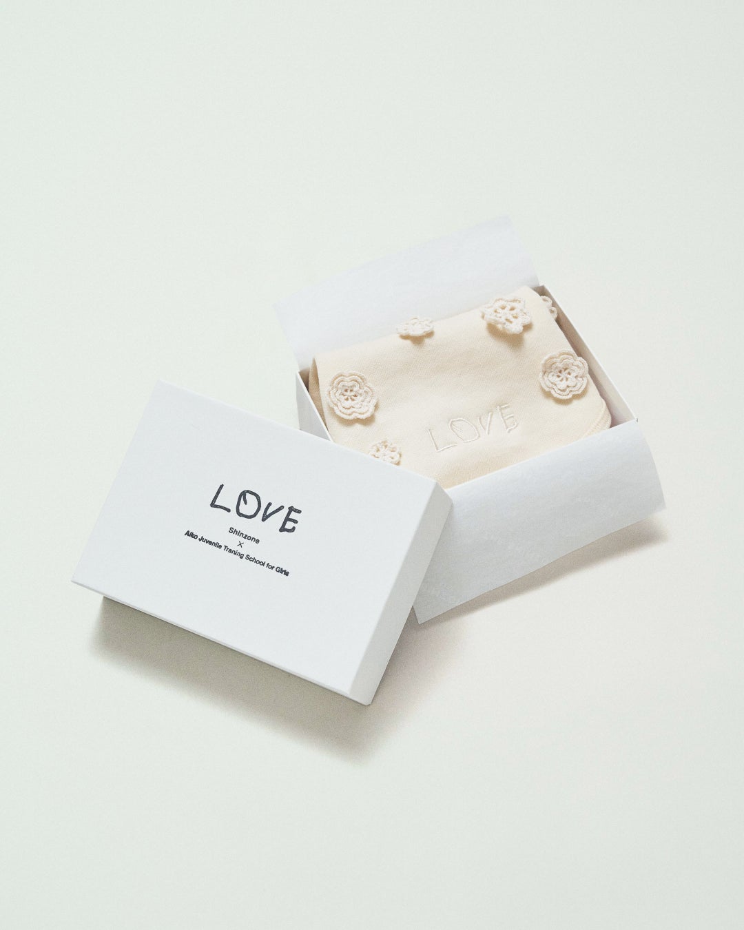 愛光女子学園の園生たちが制作したクロッシエ・レースの小花モチーフを散りばめ、手描きの「LOVE」ロゴを刺繍したベビー用スタイです。ハンドメイドのモチーフが生み出す温かみと、小さなレースが醸す可愛らしさが特徴的なアイテムです。ホワイト、ネイビーには白のレースを。そしてエクリュには生成りのレースが施されています。ロゴの「LOVE」には愛光女子学園の頭文字である「愛」と、園生たちの未来への愛と希望を託しています。画像内の箱に入ってのお届けとなります。