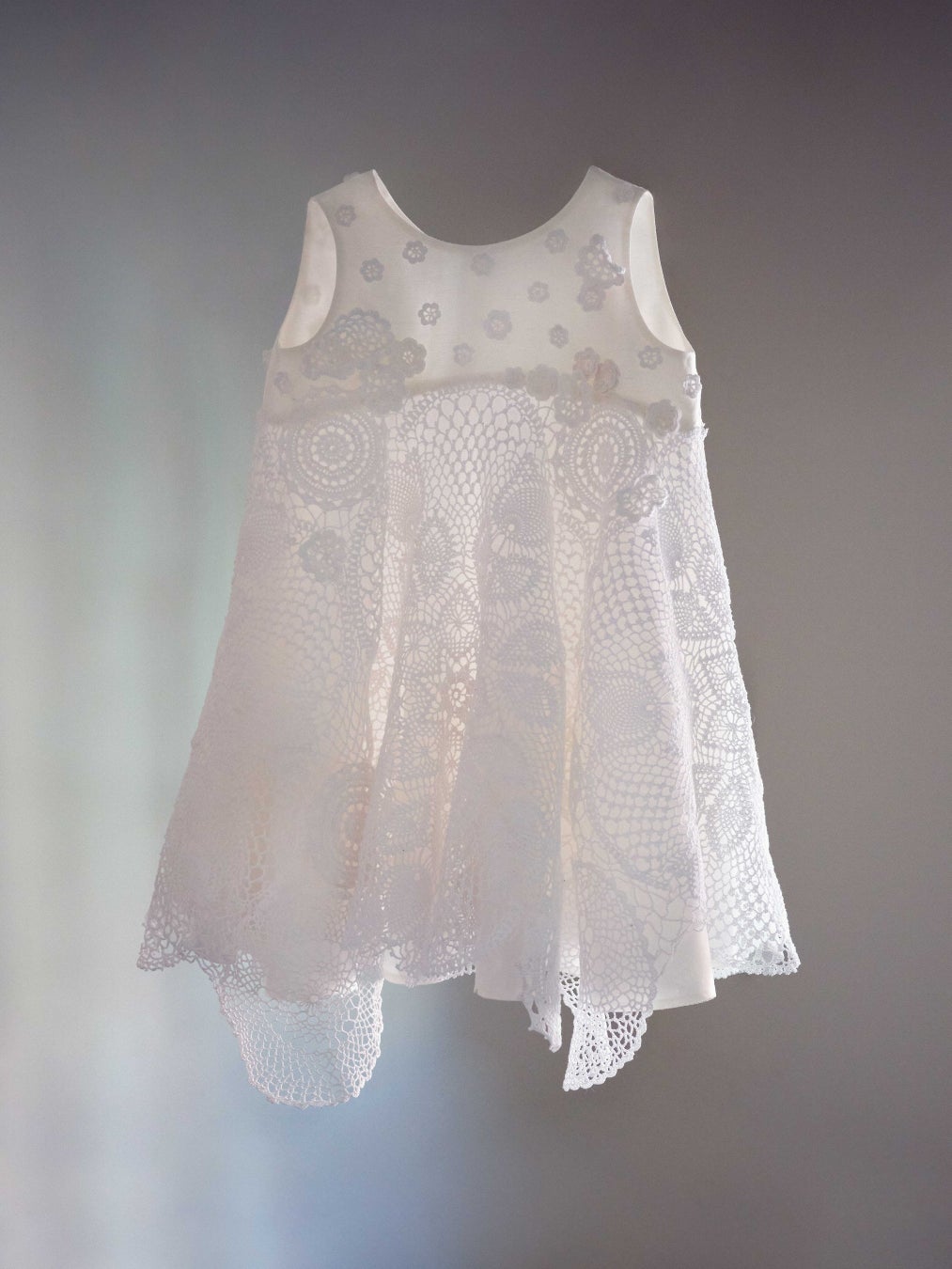 愛光女子学園の園生たちが手編みで制作した68枚ものクロッシエ・レースのモチーフを使った子供用のドレスです。身頃には繊細な小花モチーフをあしらい華やかに。そしてスカート部分には大小さまざまな形のレースをつなぎ、ボリューミィなサーキュラーシルエットを作り出しました。世界に一点だけの特別なドレスです。