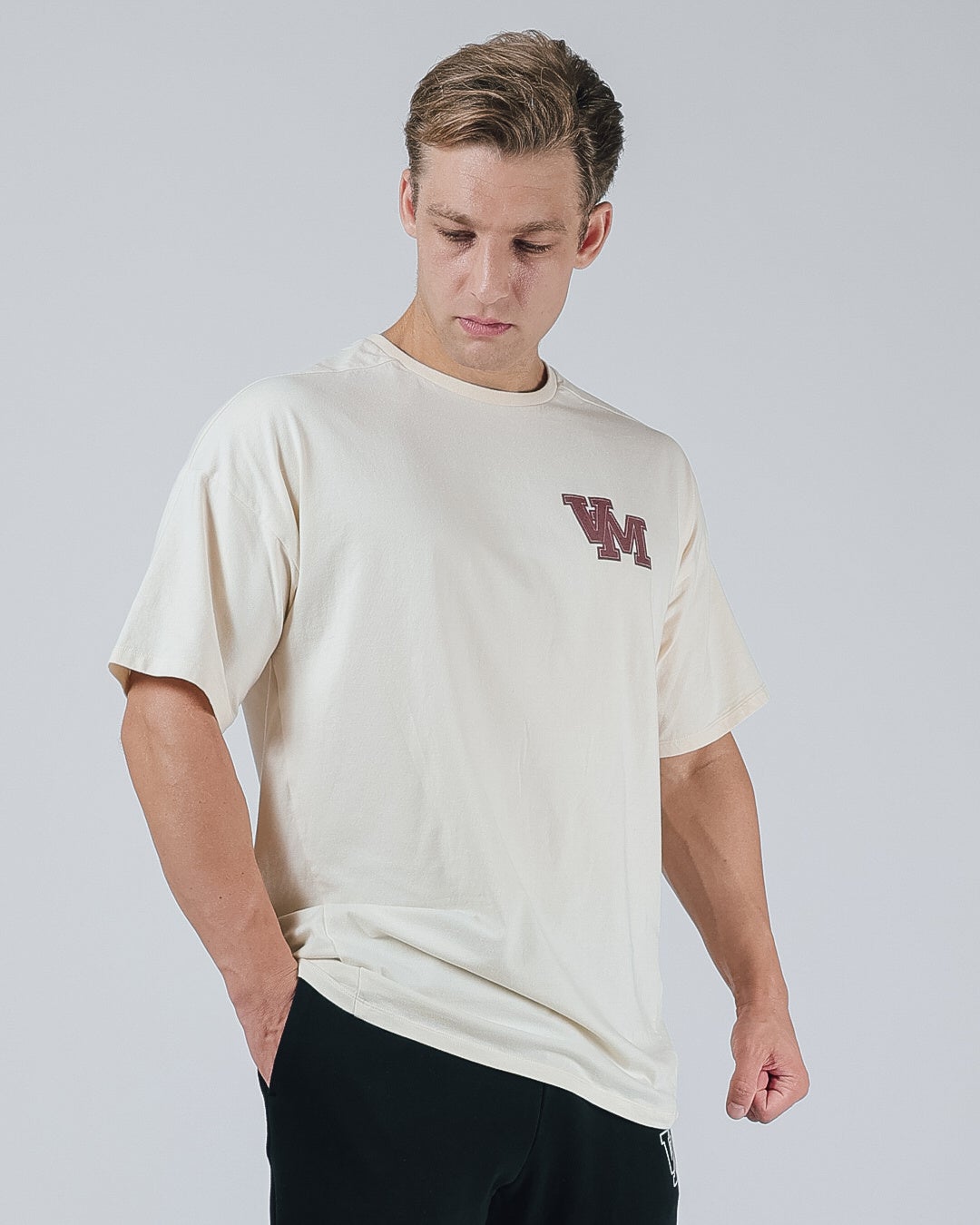 VEATM定番のビックシルエットTシャツ、筋トレやワークアウト用のトレーニングウエアとしてはもちろん、普段着用としてもご利用いただけます。デザインはカレッジ調に仕上げ、フロントにはチームロゴのVMデザインを配置、バックにはVEATMコンセプト「The only one who can beat me is me」をプリント。
