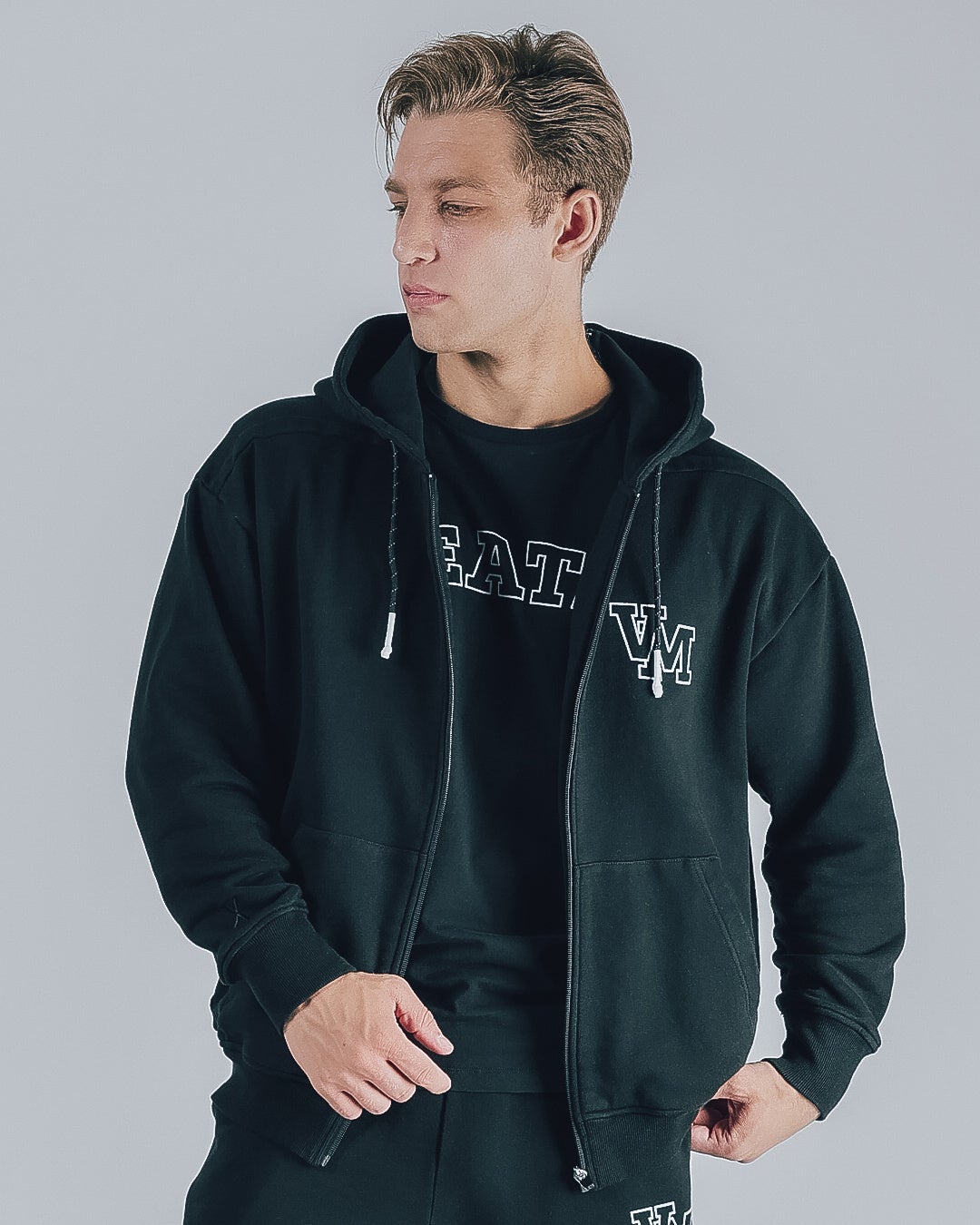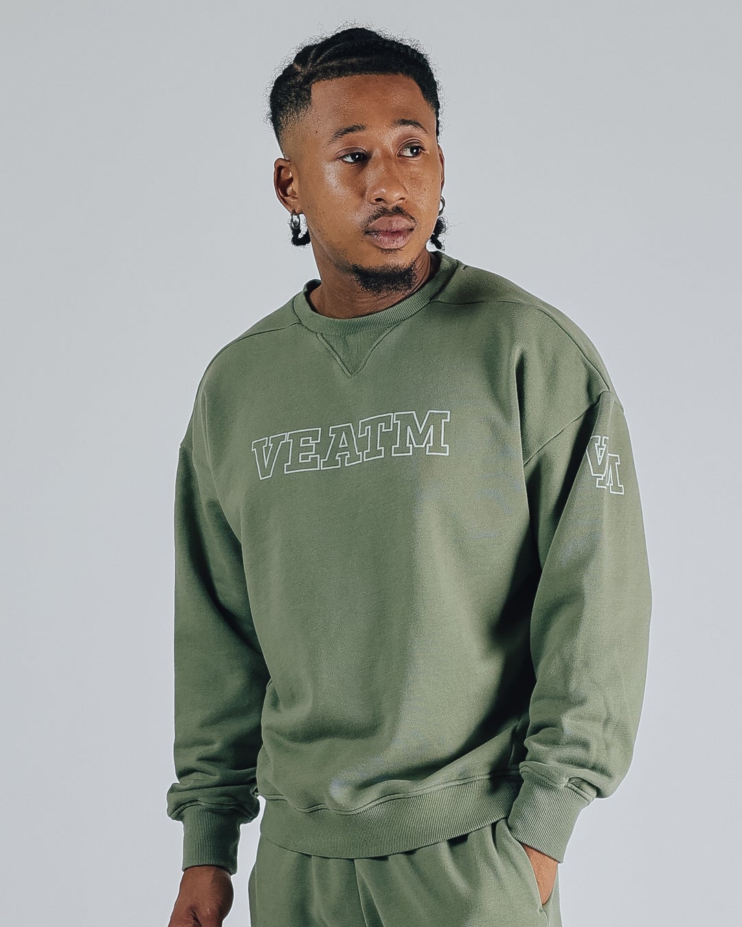 デザインはカレッジ調に仕上げ、フロントにはチームロゴをイメージしたVMデザインをプリント、袖にはVEATMロゴ刺繍を入れアクセントに。