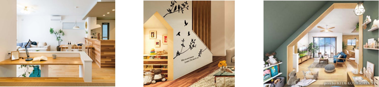 「HITO-TO-KI(ひととき)」は、子育て世代に対し“家族と過ごす今しかない時間を大切にしてほしい” という願いと、住・育・子どもの孤独・子どもの想像を創造する、の4つのテーマについて、建築を通じて解決することを目指したブランドです。家族の豊かな絆が深まっていくよう、木肌のやさしい温もりを取り入れた「人と木」の空間創りにこだわっています。