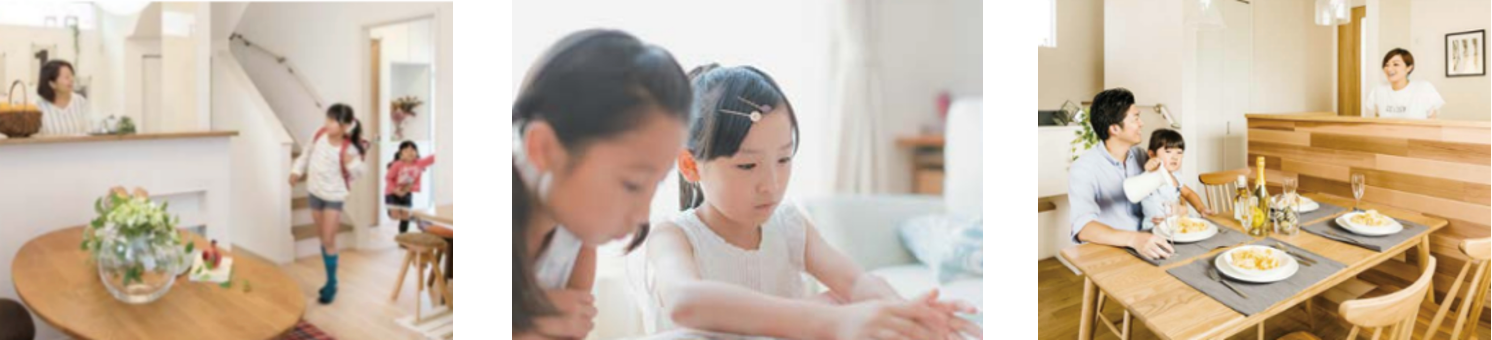 夫婦共に働く家族が抱える「子どもの孤独」。共働き夫婦にとって、子どもと過ごす時間はかけがえのないもの。しかし仕事や家事に忙しく、子どもとゆっくり遊ぶ時間がもてず悩むことはありませんか?たとえわずかな時間でも、家族みんなが笑顔で過ごせたら。「HITO-TO-KI(ひととき)」はそんな住まいを描いています。挨拶や会話が自然と生まれるリビング階段もその一つ。親の近くで勉強ができるようリビングにカウンタースペースを設けました。家族の写真を飾れるギャラリースペース。家族をそっと包み込む木々の温もりある空間。リビングが子どもにとって一番居心地のよい場所になる住まいです。