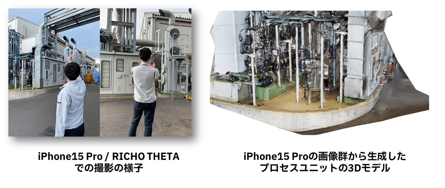 今回の実証実験では、化学品メーカー様協力のもと、iPhone15 ProとRICHO THETAの2つの市販機種を使用して工場の3Dモデルを作成しました。各機種を利用し、1分程度で撮影したデータを使ってフォトグラメトリ処理を行い、わずか10分ほどの短いデータ処理時間でEMLinkと連動可能なデジタルツインの生成に成功しています。