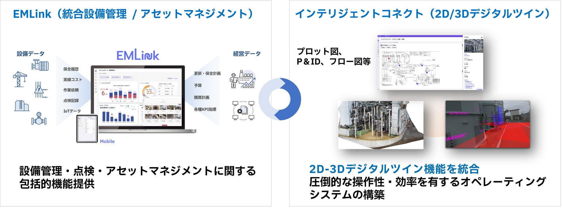 『かんたんデジタルツイン』は、今後発表されるEMLinkの新機能、「インテリジェント・コネクト」の一部として実装される予定です。同機能ではEMLink内のデータと工場2D/3Dデータ(デジタルツイン)を自在に行き来することで、工場設備の習熟度や経験に関わらず、極めて直感的に業務を推進することが可能となります。
