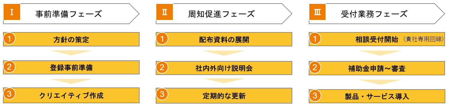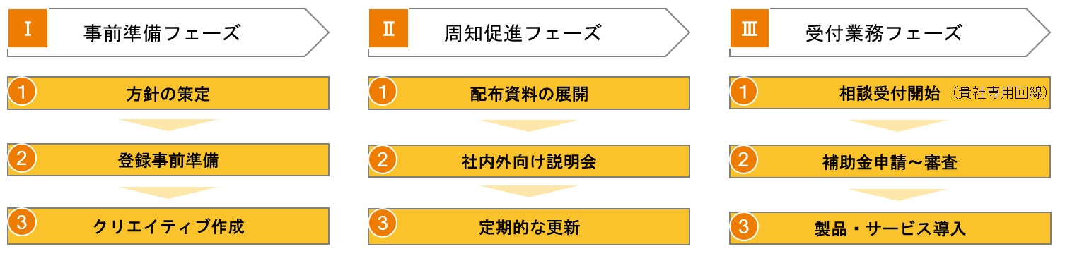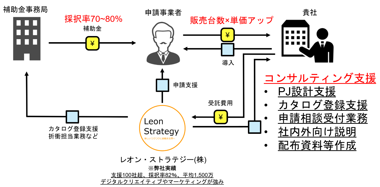 弊社では、以下のスキームにより、「カタログ登録→周知→申請支援」の体制をクイックに構築し、補助金を活用した総合コンサルティング支援を行っています。