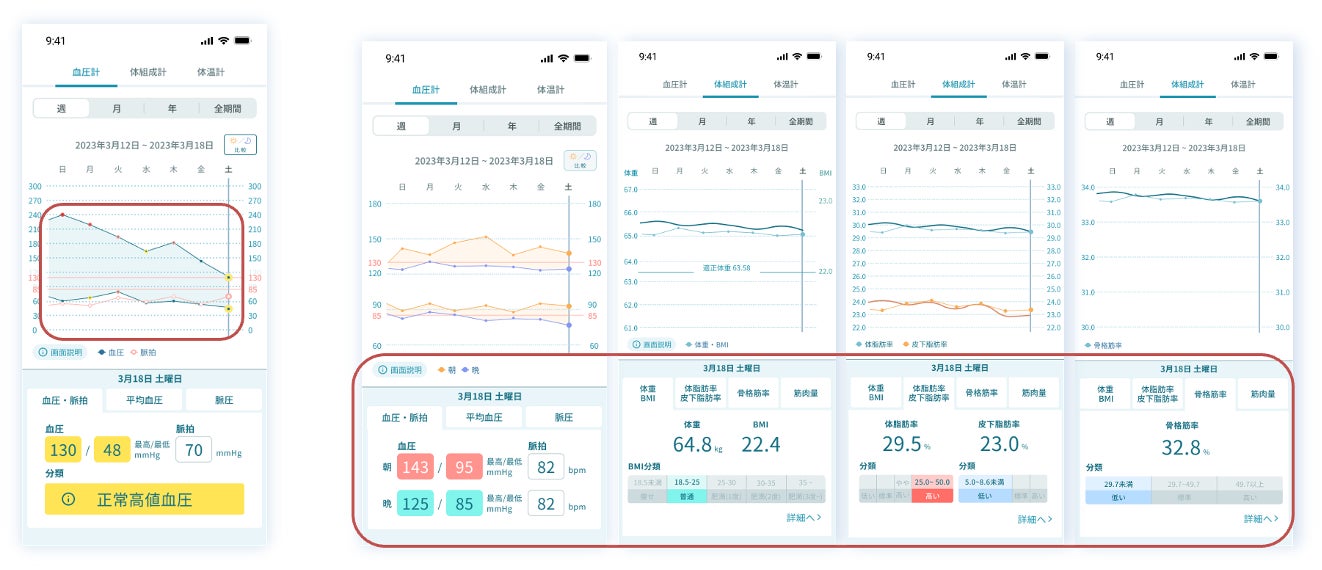 日々の測定結果を見やすいグラフで表示。健康状態の変化を直感的に把握することができます。