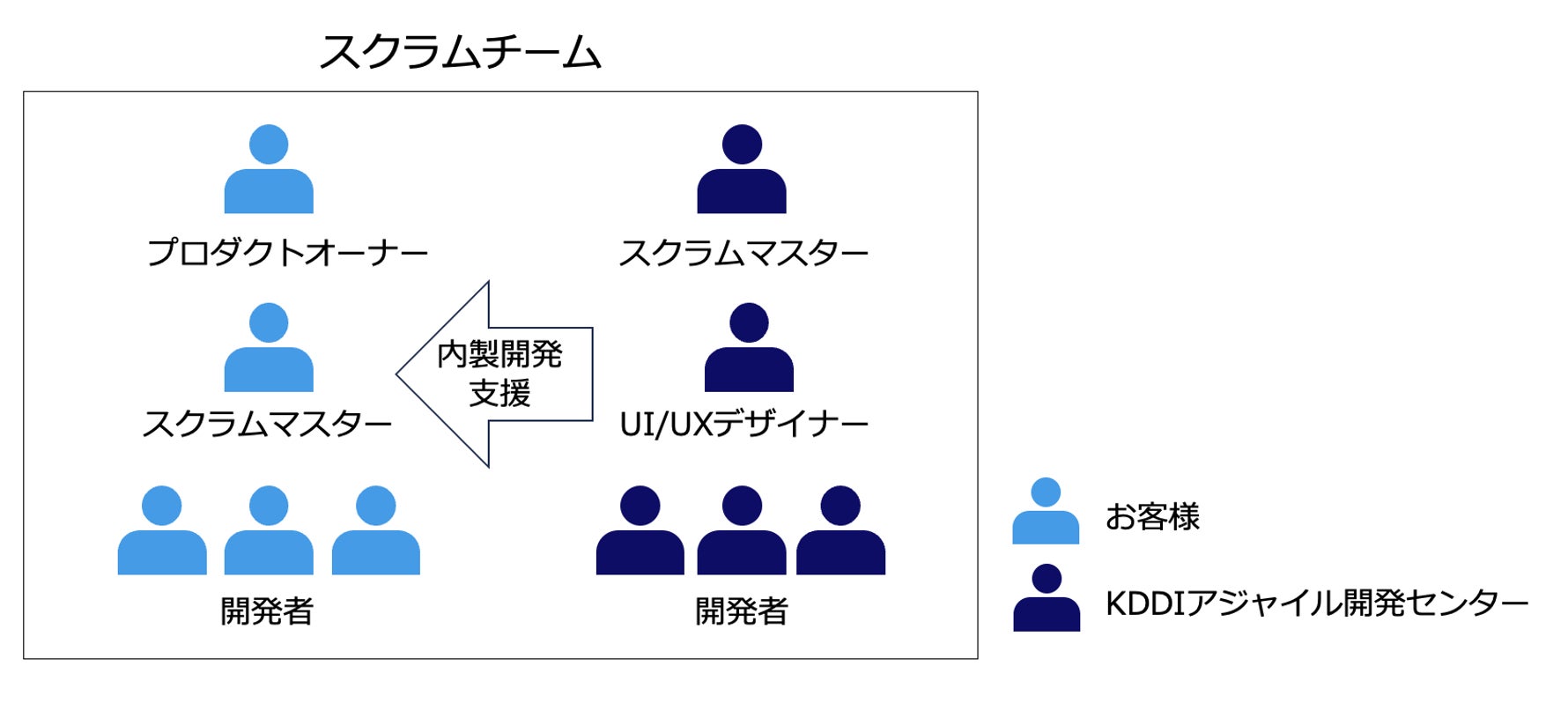 KAGで提供している内製化支援では、お客様を外部から支援するのではなく、混成チームを組成し全員が同じひとつのチームとなり開発に取り組むかたちで支援しています。
