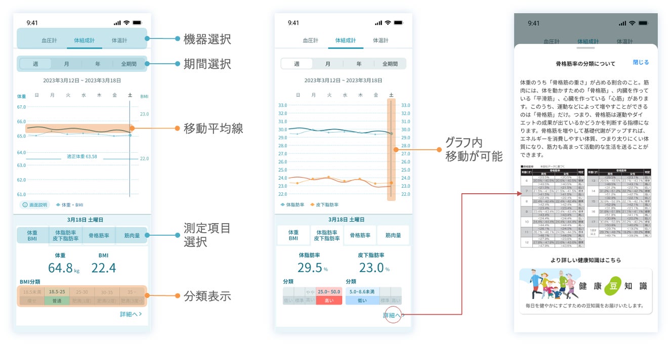 グラフ機能の「機器選択」、「期間選択」、「分類表示」、「移動平均線」で傾向の把握をわかりやすくサポート。直感的に"今"の健康状態を把握することができます。