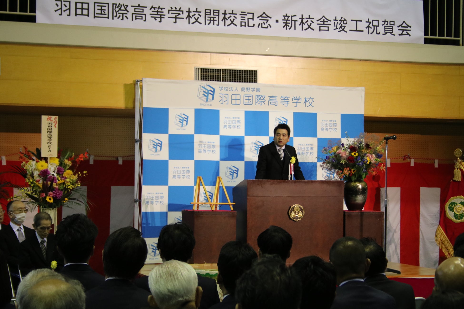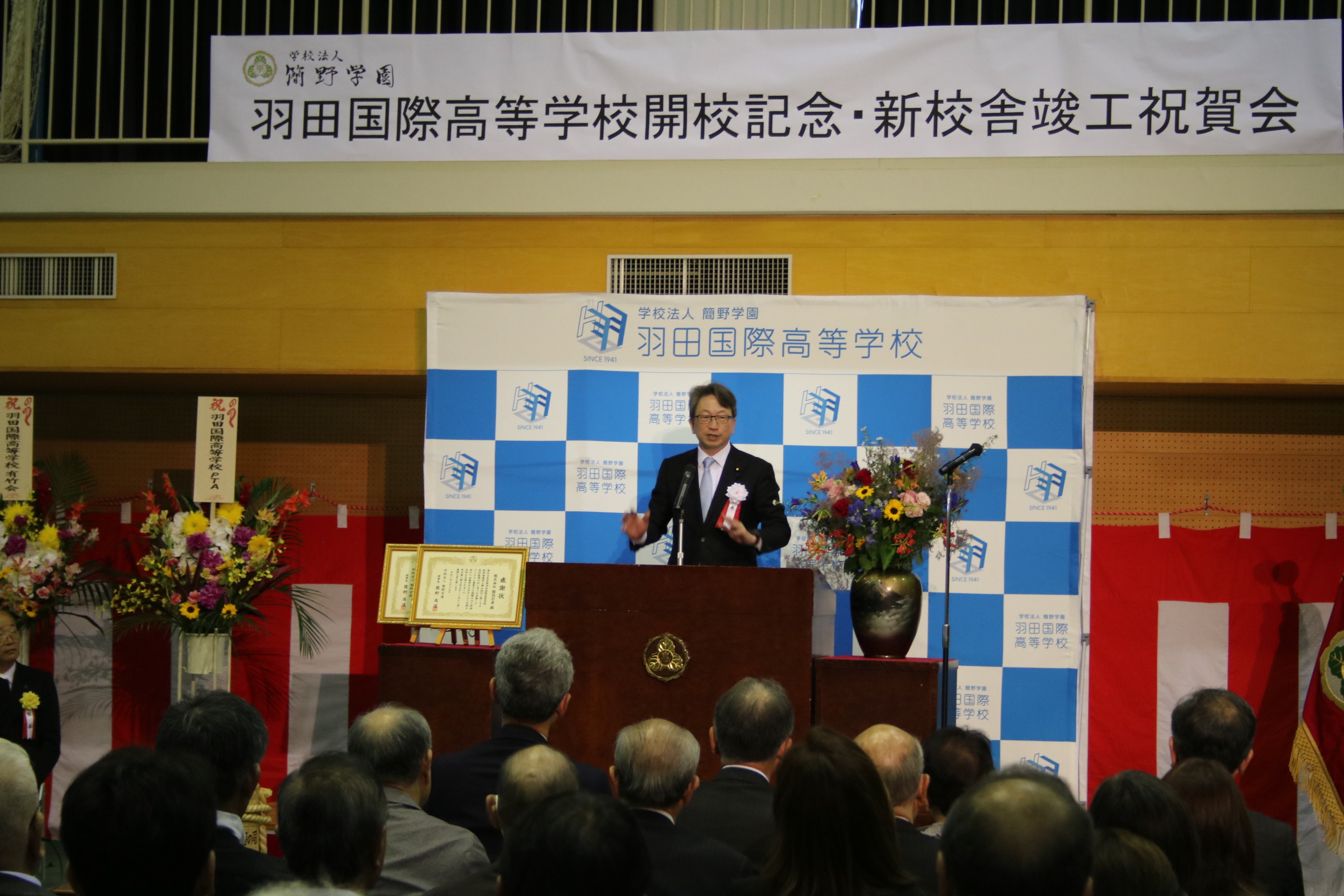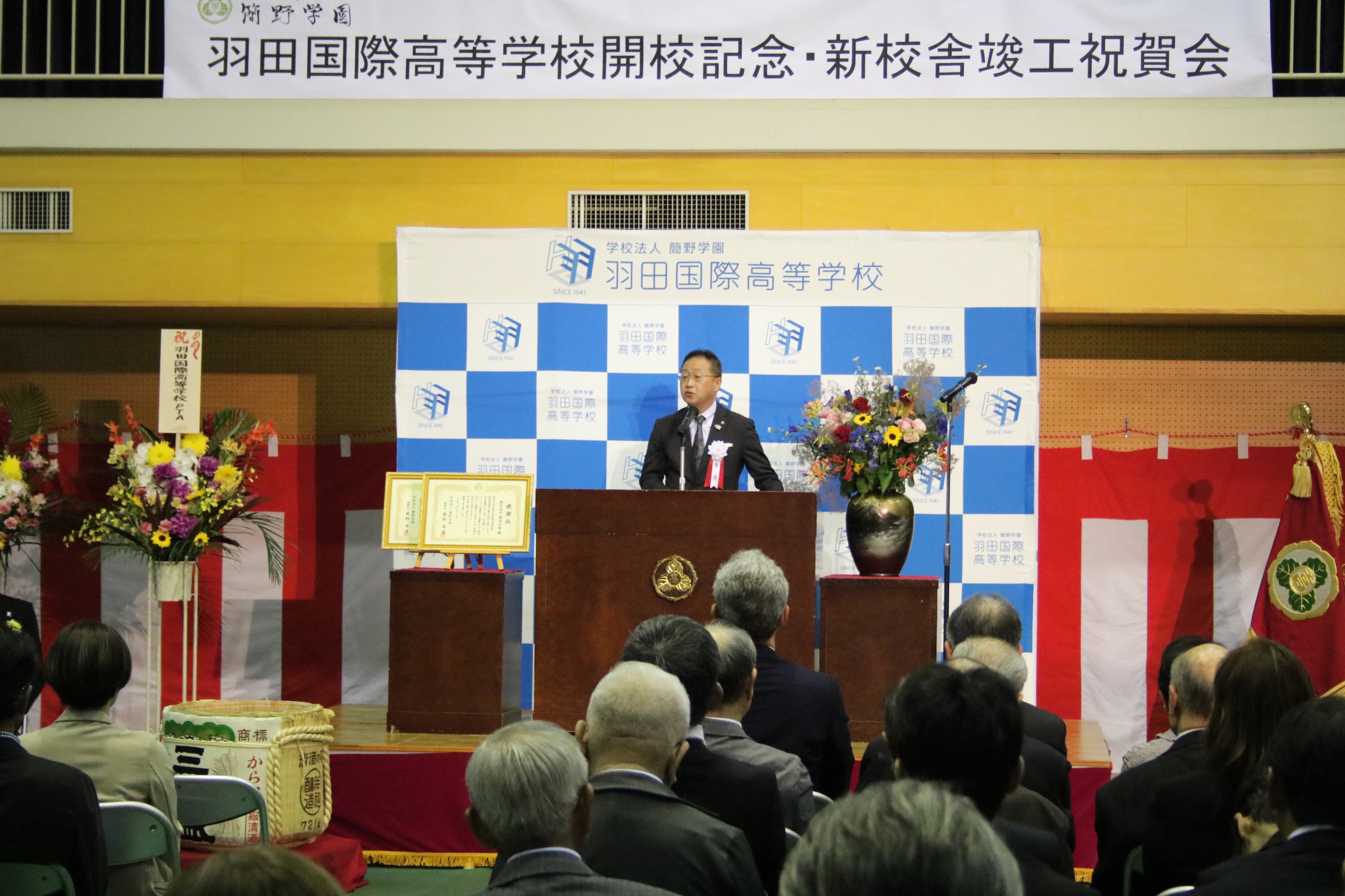式典では、冒頭に主催者簡野髙道理事長がご挨拶申し上げ、続けて地元より平将明衆議院議員・鈴木晶雅大田区長より、羽田国際高等学校の開校に対して温かいご祝辞を頂戴しました。また、今回の新校舎建築にご尽力いただいた株式会社類設計室様と、株式会社PS三菱様に対して、理事長より感謝状を贈呈いたしました。