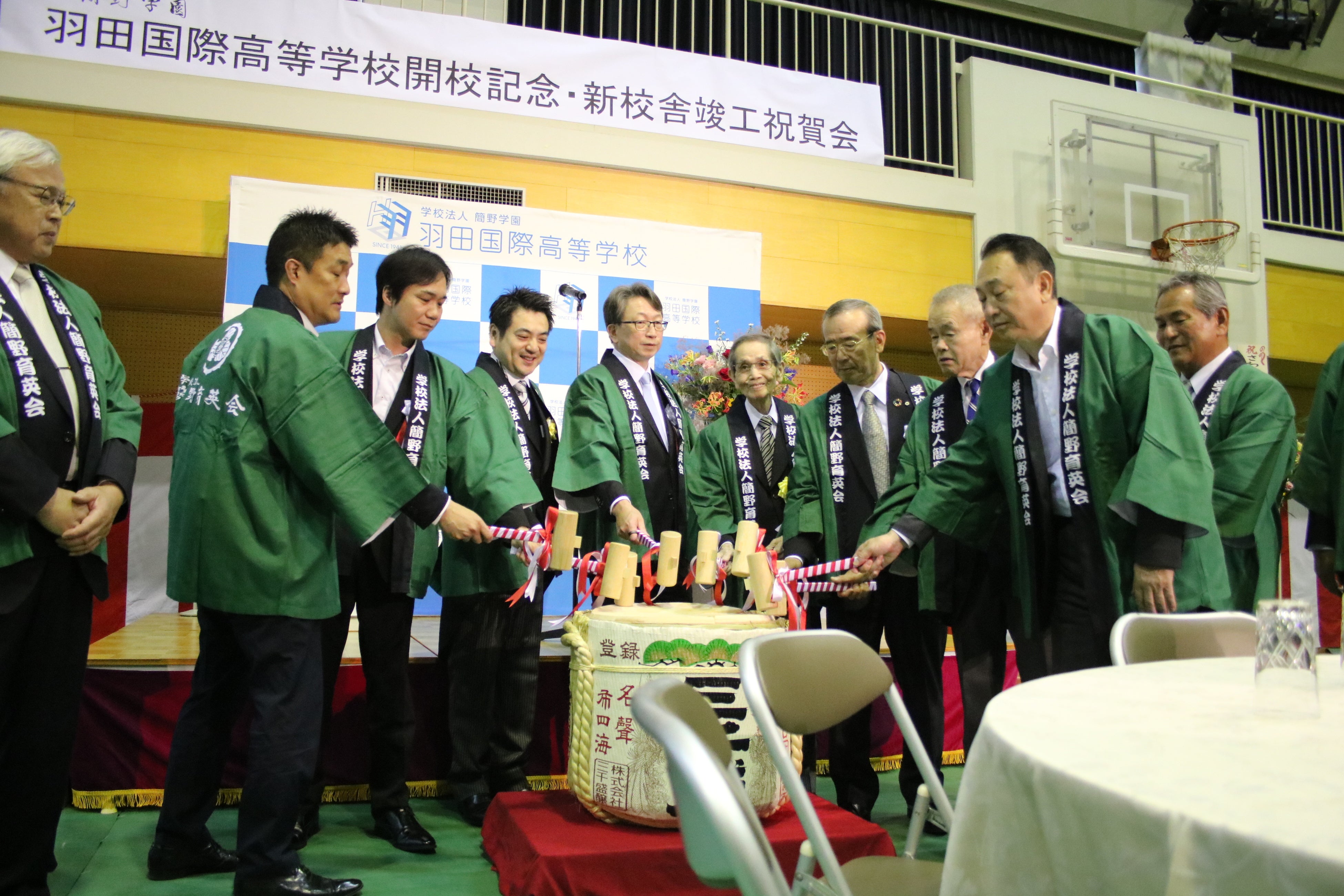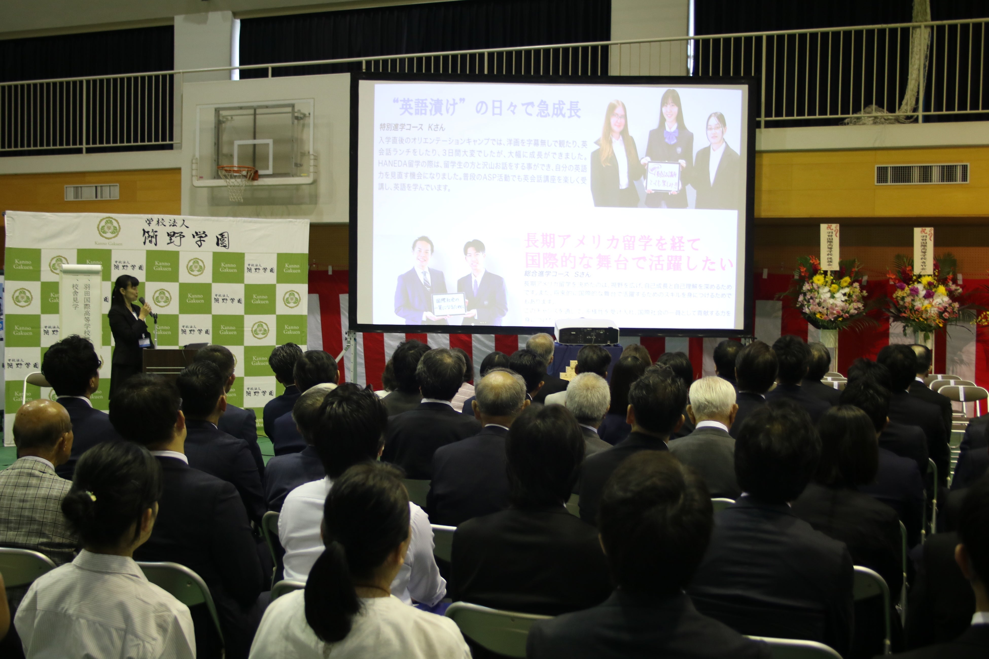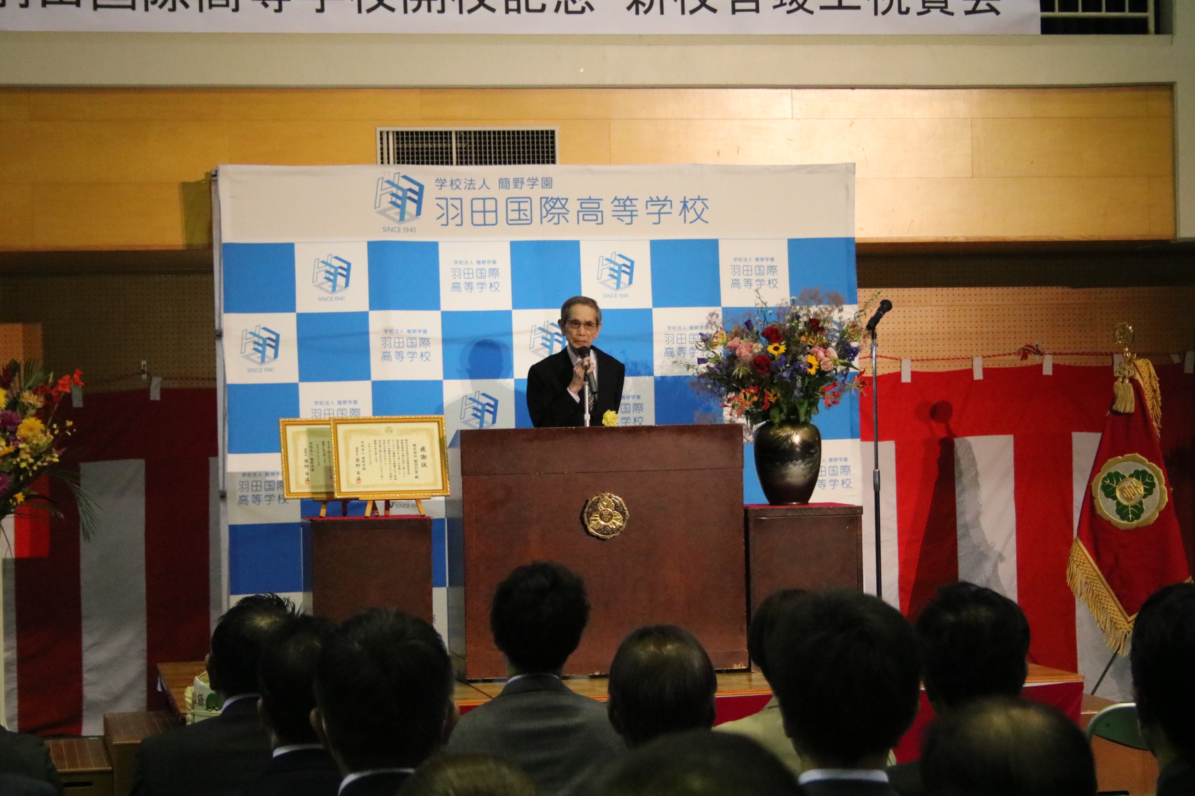 式典では、冒頭に主催者簡野髙道理事長がご挨拶申し上げ、続けて地元より平将明衆議院議員・鈴木晶雅大田区長より、羽田国際高等学校の開校に対して温かいご祝辞を頂戴しました。また、今回の新校舎建築にご尽力いただいた株式会社類設計室様と、株式会社PS三菱様に対して、理事長より感謝状を贈呈いたしました。