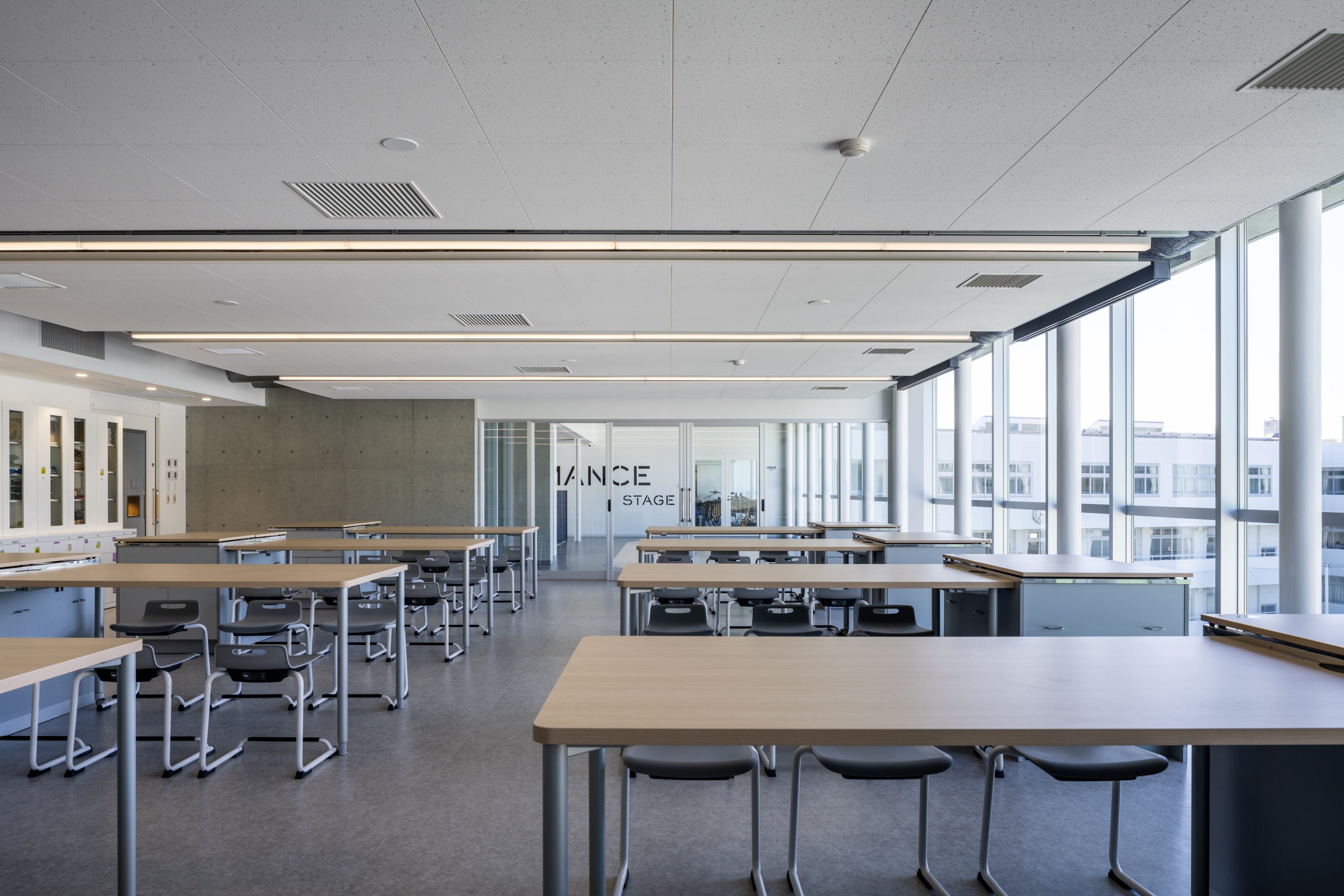 新校舎は、「K-Place」と名付けられ、羽田国際の新しい学びを体現するべく、開放感にあふれた空間と生徒のアクティブな学びを表現する場として“ステージ”をコンセプトとしています。フレキシブルな学びの場を多く設けることにより、多年齢・多文化・社会から刺激を受け、学年や学校の垣根を越え、より主体的な考え方を日常の学園生活で学ぶことができるステージが誕生しました。